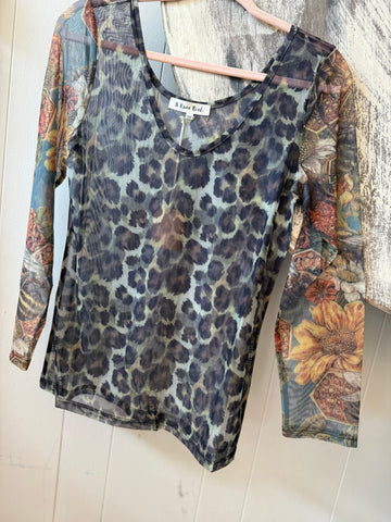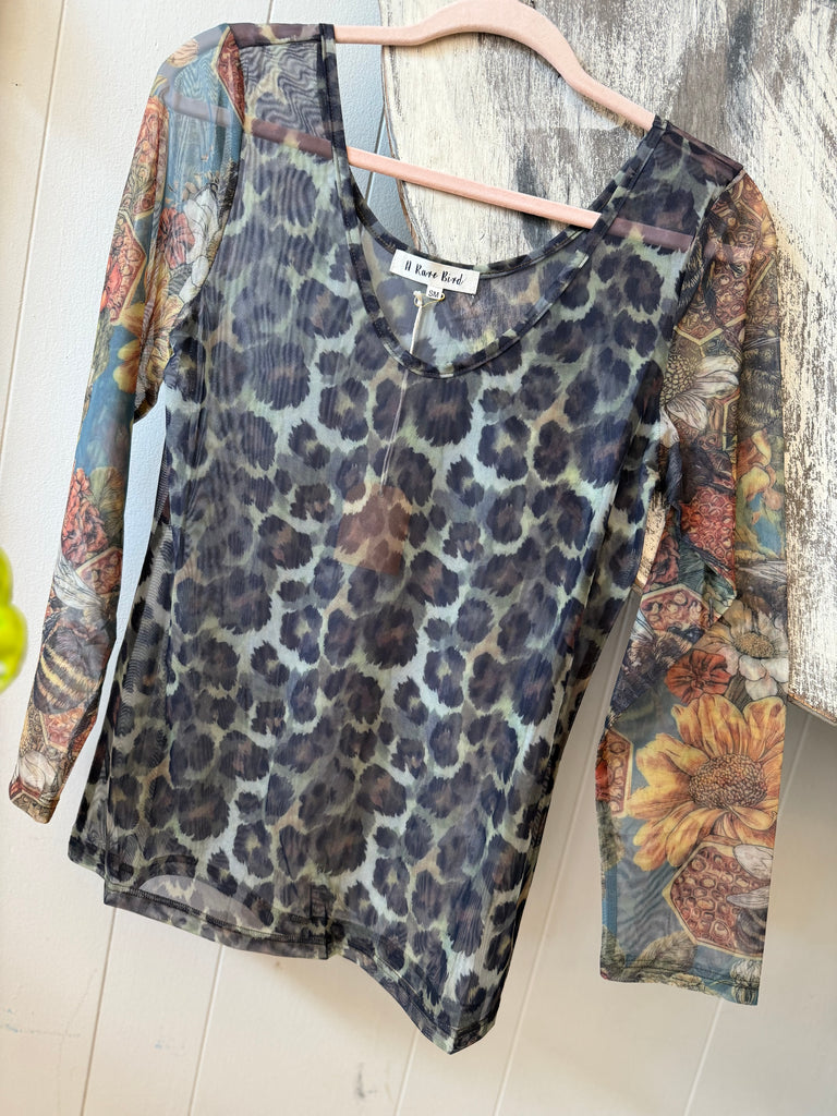 The Rare Bird Bee Mesh Top features a striking leopard print body paired with unique honeycomb bee-patterned sleeves. Designed with a flattering scoop neck and a great fit, this versatile piece works perfectly as a layering essential or a bold solo statement. Comfortable and stylish, it adds a touch of wild charm and playful detail to any wardrobe.