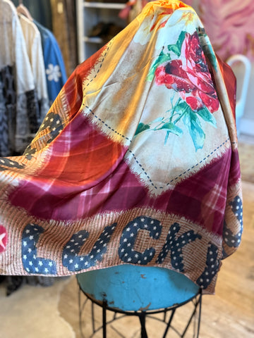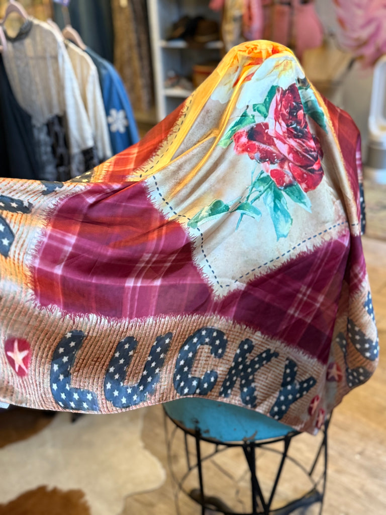 An artistic showstopper, this oversized wild rag features a romantic rose at the center set against a soft champagne backdrop, framed by a rich wine-toned plaid. The word “LUCKY” repeats along all four sides, adding meaning and charm to this one-of-a-kind piece.