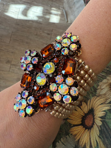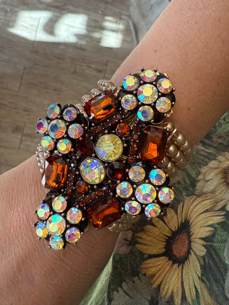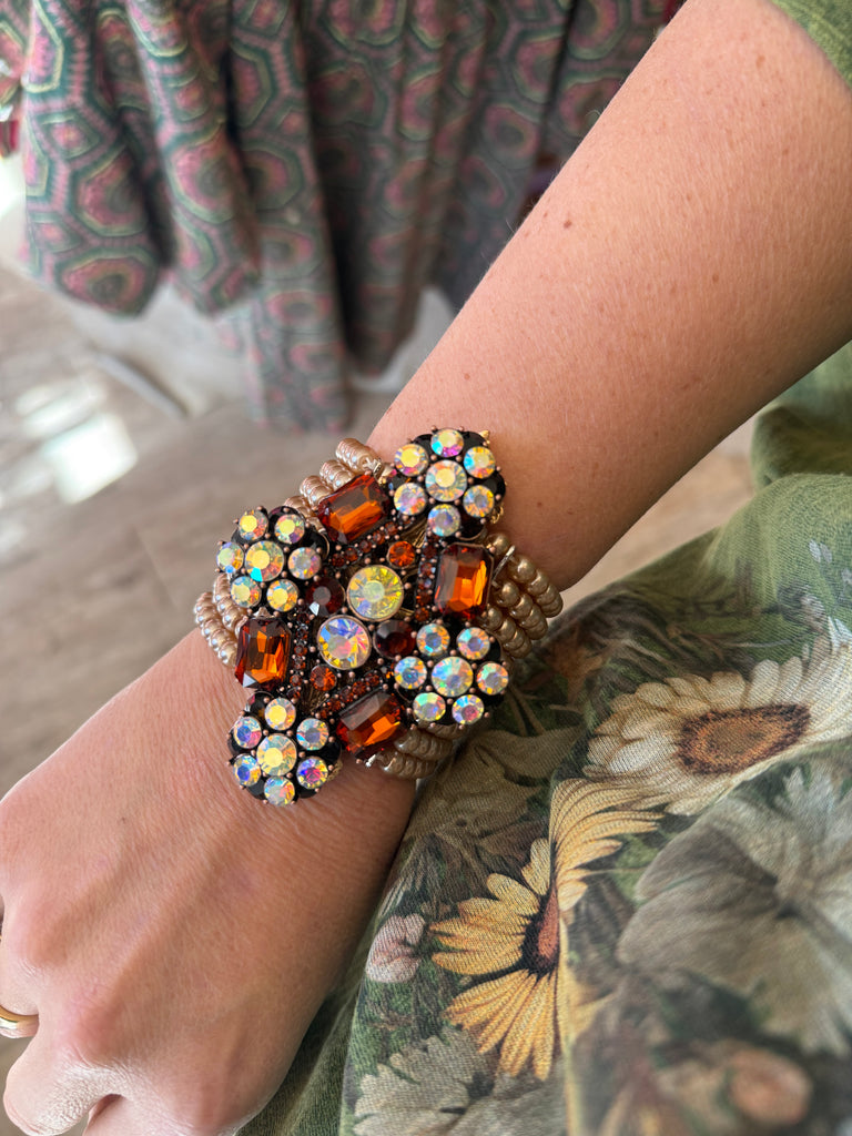 Turn up the sparkle with The Rare Bird Firefly Luxe Bracelet — a showstopping statement piece handcrafted with layers of amber gems and iridescent crystals that shimmer with every move. Set on an easy stretch band, it combines comfort with couture-level glam.