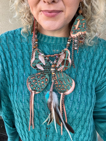 The ARB Leather Butterfly Necklace in Turquoise and Brown showcases a handmade leather butterfly pendant, each one uniquely crafted to ensure no two are alike. Suspended on a beaded strand that ties at the back, this necklace offers a comfortable, adjustable fit and a distinctive touch to your look.