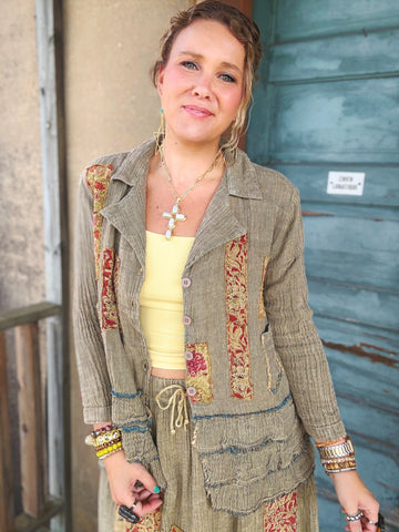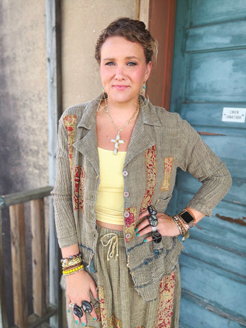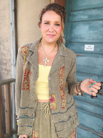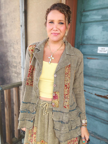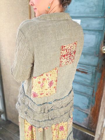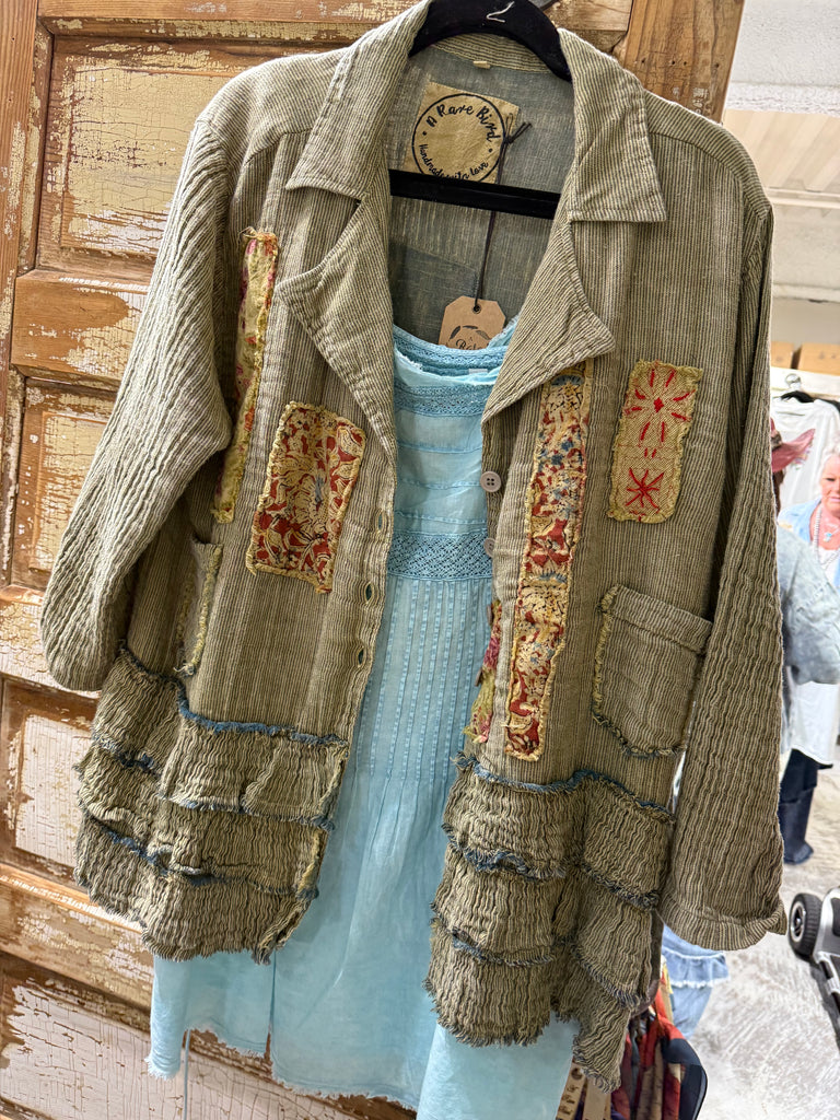 Designed by A rare bird, the Ruffle Shirt is crafted from an ultra-soft woven fabric in a serene blue hue, adorned with charming floral patches. Delicate ruffle trim along the sleeves and hem adds a touch of playful femininity. Effortlessly stylish, it’s the perfect blend of comfort and whimsical detail—easy to dress up or wear casually.