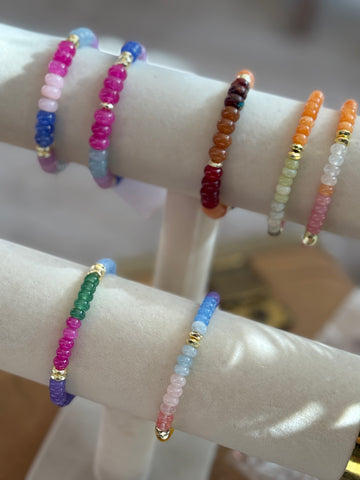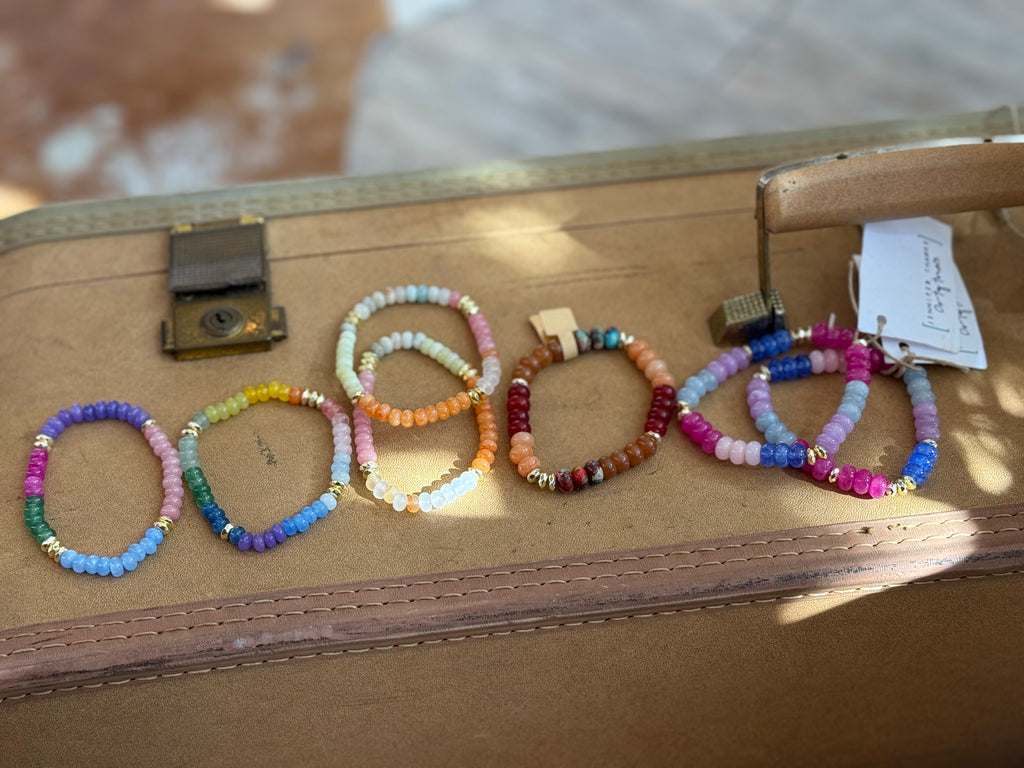 Authentic dyed jade beads paired with gold accents create a luxe yet easy stretch bracelet. Available in five color combinations, perfect for stacking or wearing solo.