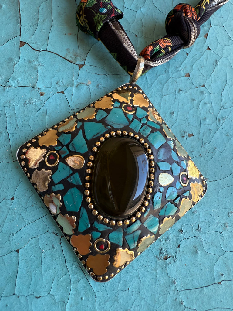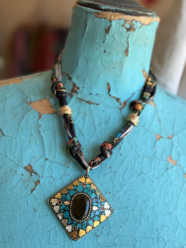 A black onyx center stone sits within a square pendant of turquoise chips and golden touches. Hanging from a floral-patterned scarf necklace with delicate knotting, this piece combines natural mystique with bold bohemian spirit.