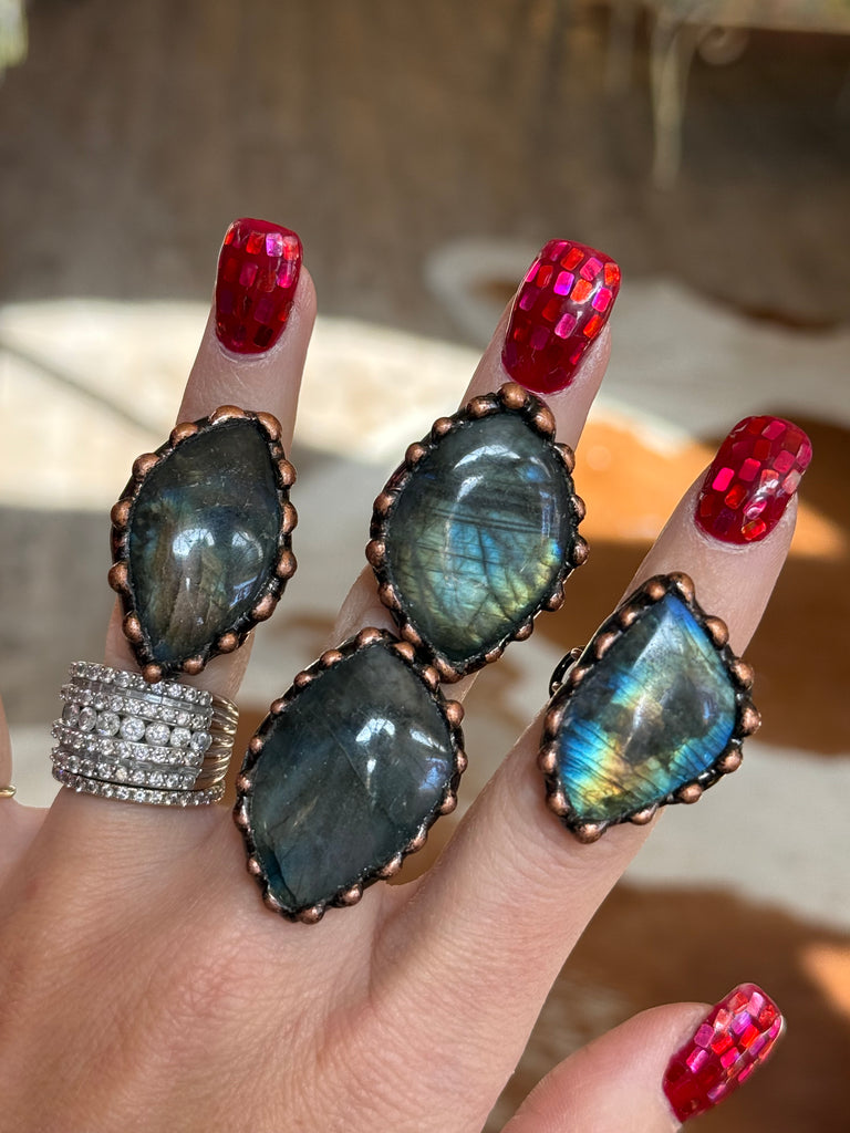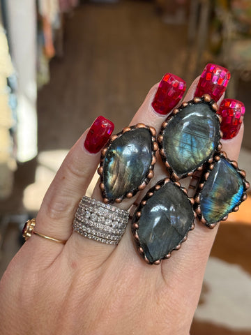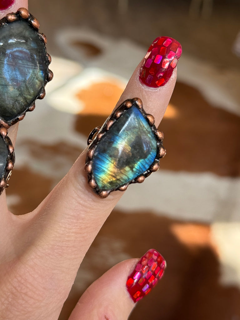 Each labradorite stone features incredible rainbow flash, making every ring one of a kind. Finished with copper-tone hardware and an adjustable back for the perfect fit.