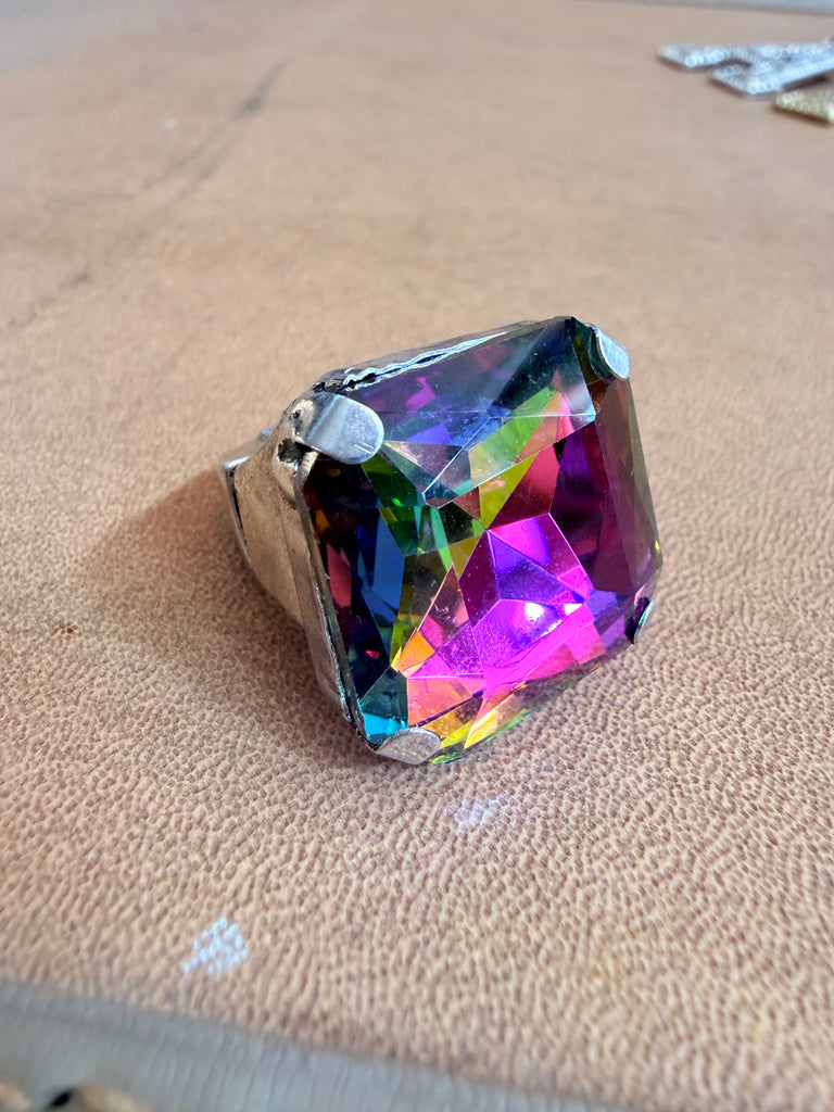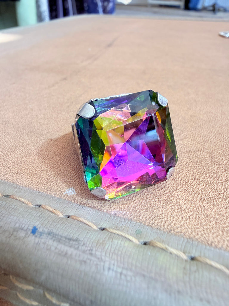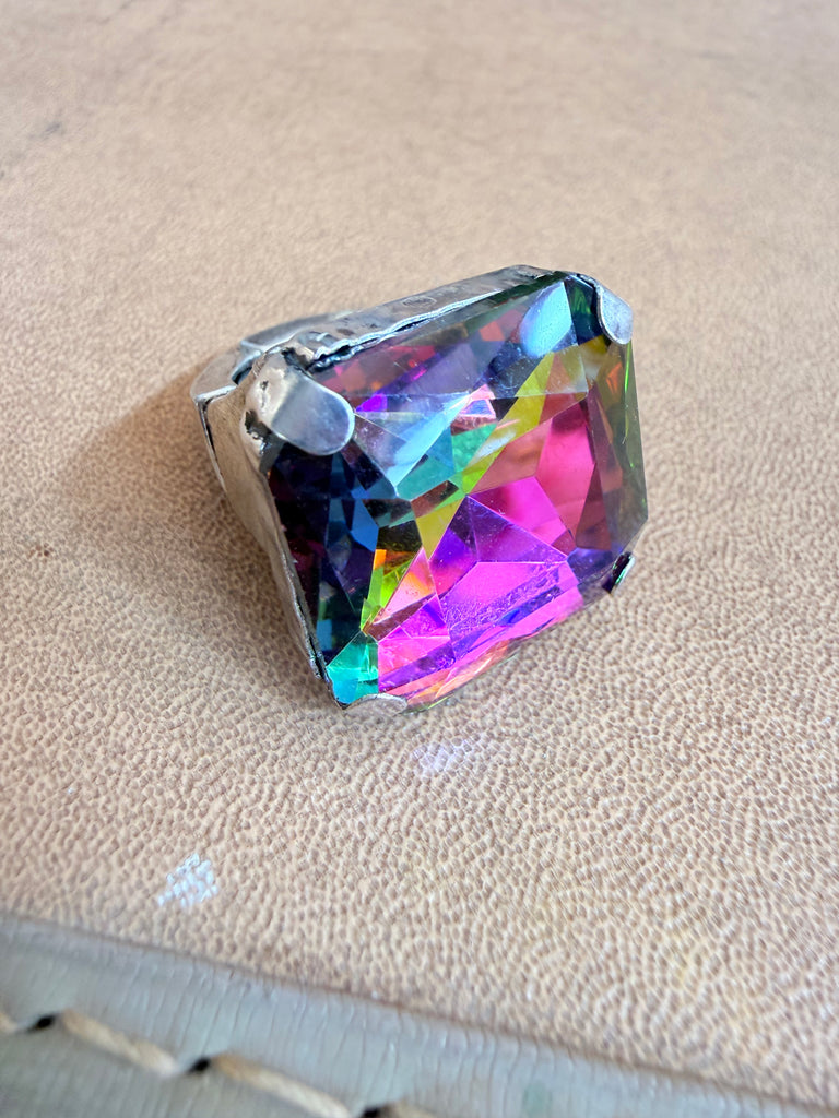 Bold, fiery, and impossible to miss 🔥 The Volcano Glow Stretch Ring features a chunky faceted volcano crystal that shifts with mesmerizing flashes of deep plum, gold, and iridescent rainbow tones. Set on a comfortable stretch band, this beauty delivers statement sparkle with effortless wear.