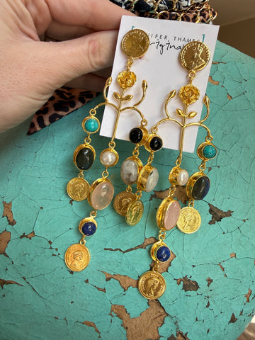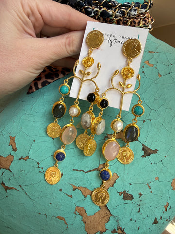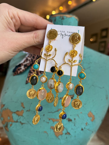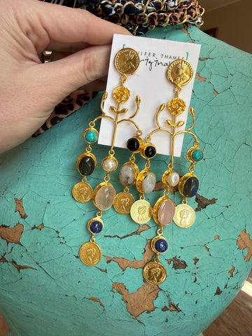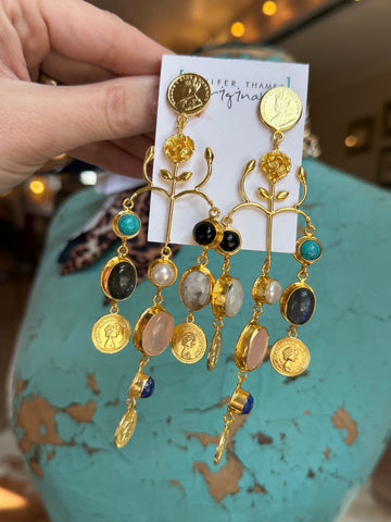 Rich with texture and bohemian spirit, these medium-weight statement earrings feature layered coins and natural gemstones that catch the light with every movement. Artisan-crafted in Mississippi, they blend earthy elegance with upscale boho styling — perfect for dressing up or grounding a casual look. Hypoallergenic and nickel/lead free.