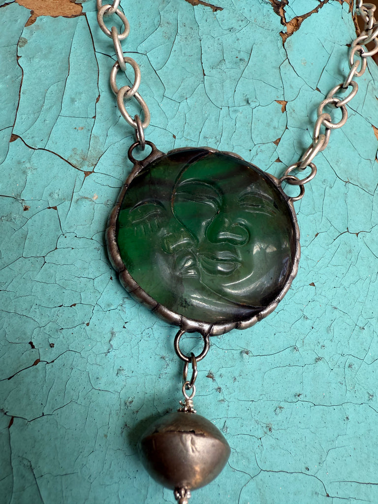 Handmade by the iconic Art by Amy, this stunning statement necklace features a carved Amazonite moon face—a symbol of calm, intuition, and feminine energy. Set in Amy’s signature hand-soldered bezel and finished with a chunky silver chain and a whimsical drop charm, every detail feels soulful and intentionally crafted.