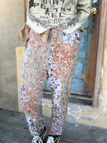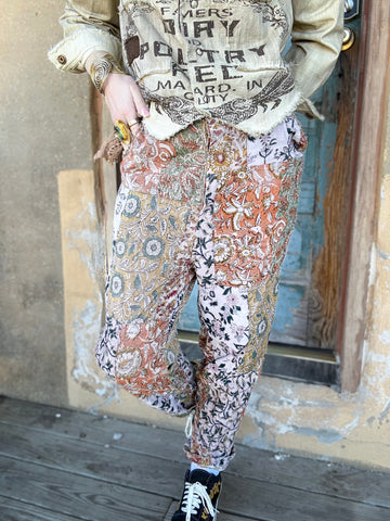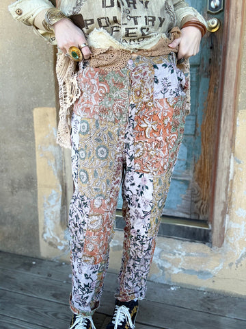 These lightweight velvet-feel pants feature patchwork paisley and floral designs in a hippie-boho mosaic that pairs easily with neutrals.