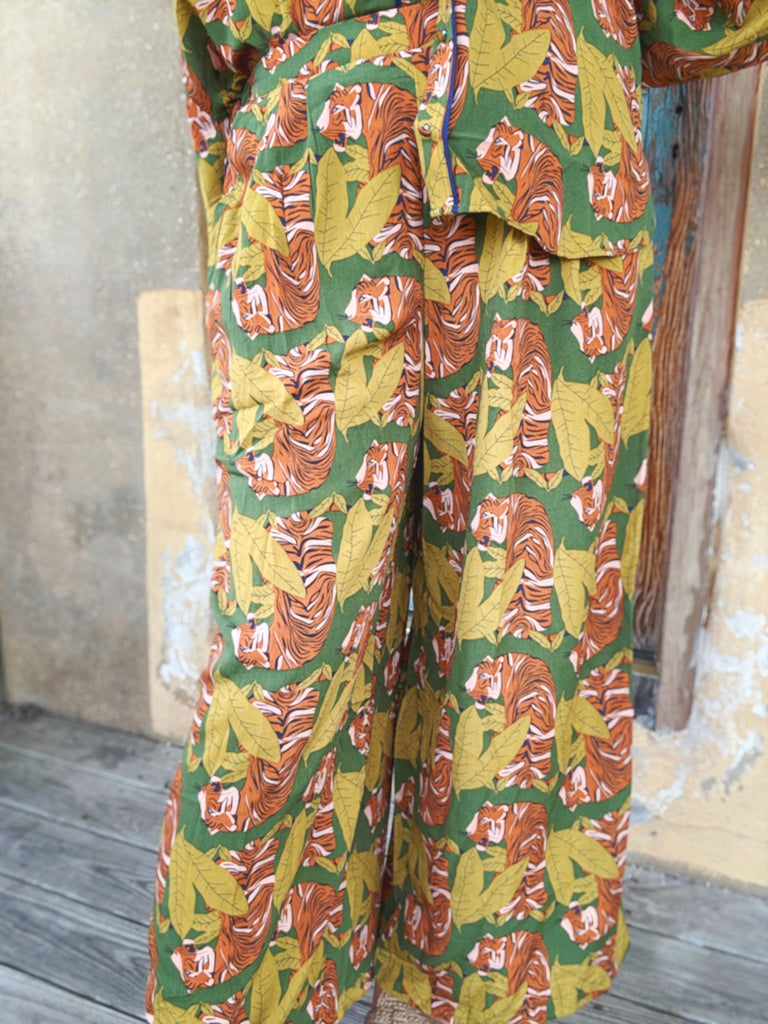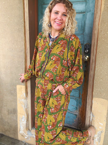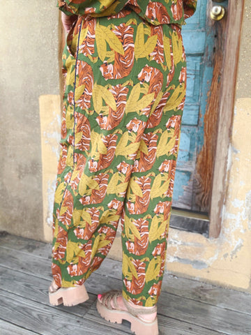 The perfect balance of comfort and sophistication, the Whispering Jungle Pants are designed for effortless, free-spirited style. Made with a leafy olive and tiger print to echo the top, these wide-leg pants feature a flat front with an easy elastic waistband in back for all-day comfort. Side pockets add a functional touch, while the fluid silhouette creates that coveted boho flow. Available in Small (4/6/8), Medium (10/12), and Large (14/16). Pair with the matching top for a bold set or style solo with your fall staples.