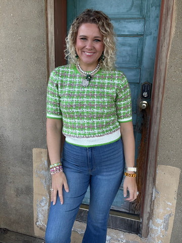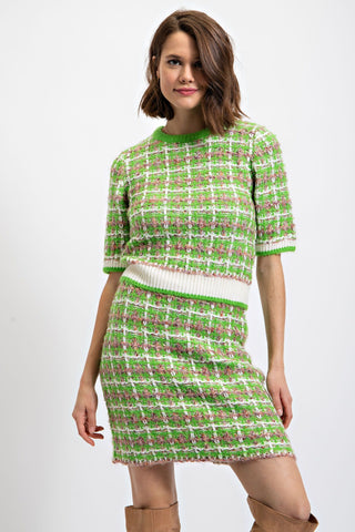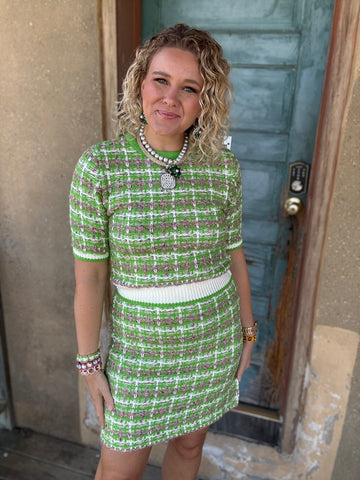 Timeless meets playful in the Garden Party Tweed Set. Woven in a dreamy mix of lime green, taupe, and ivory, this soft-as-a-cloud tweed is a modern nod to your favorite classic designer. The matching top and skirt are perfection together, yet versatile enough to style apart for endless looks — pair the skirt with boots and a chunky sweater, or layer the top with denim for casual chic. Classic, feminine, and just a little fun, this set is your new go-to for everything from brunch to evening strolls.