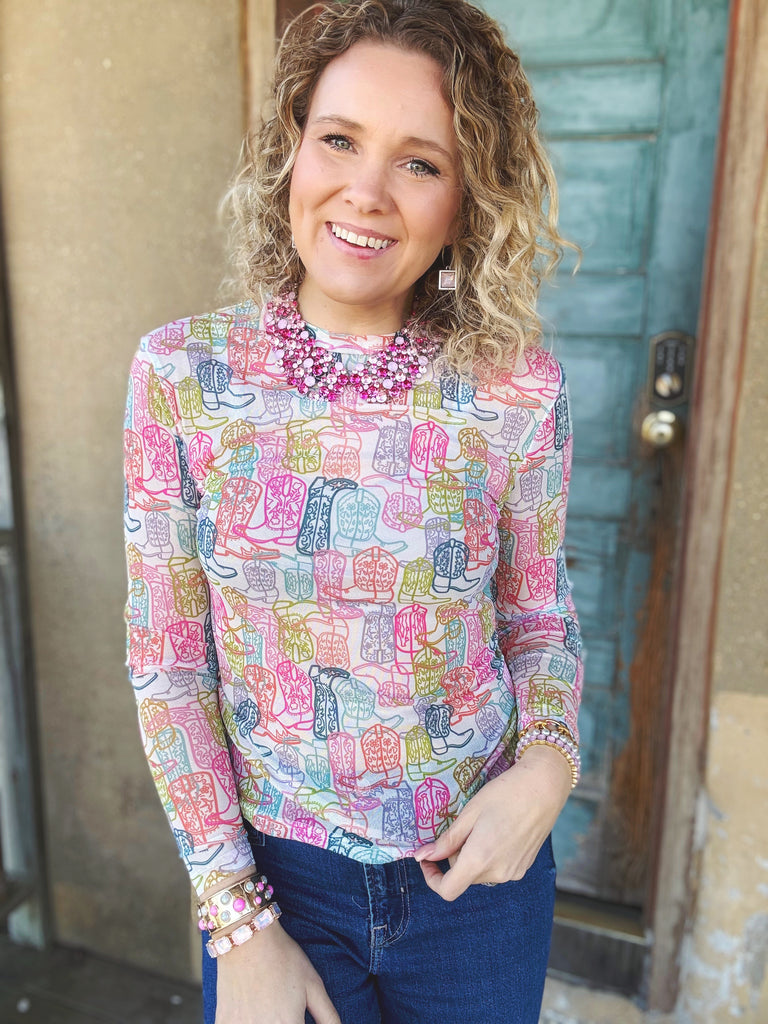 A playful layering piece with serious personality. The Kickin’ Colors Mesh Top features an ivory base covered in a vibrant allover print of multicolor cowgirl boots — bold, fun, and full of Western charm. Made from a lightweight mesh with incredible stretch, it hugs comfortably while still offering room to move.