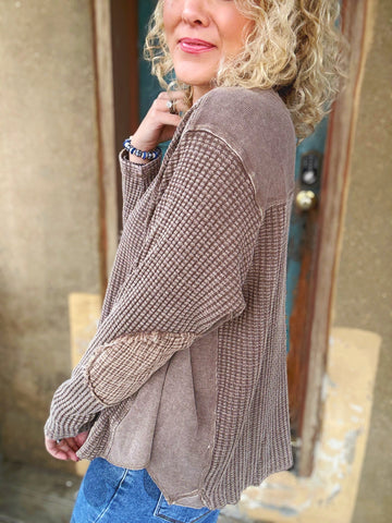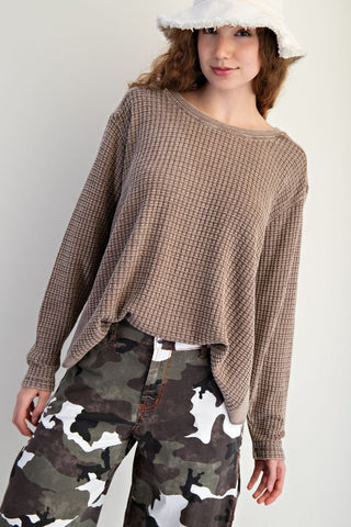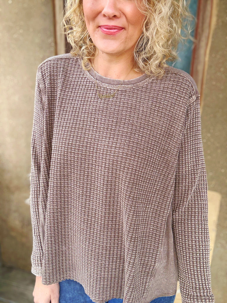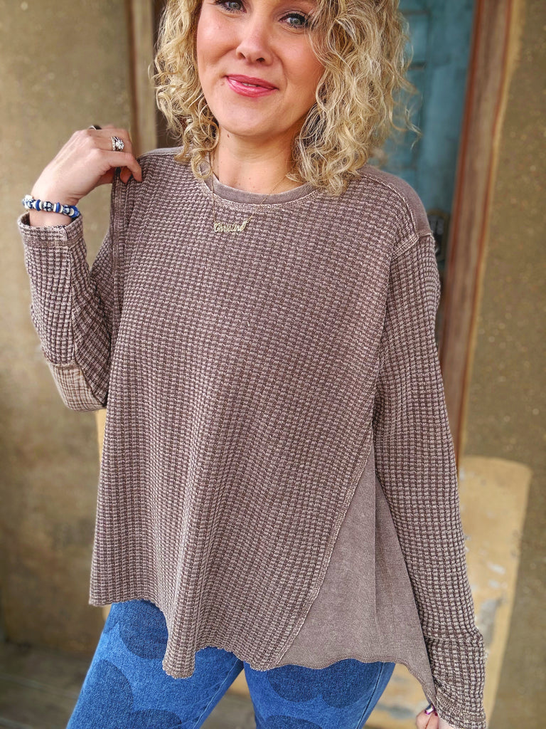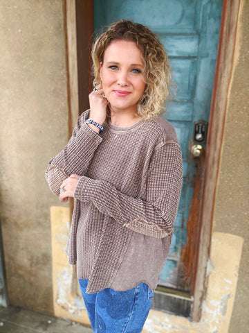 Easy, cozy, and made for everyday wear, this mocha waffle knit thermal is the kind of piece you’ll reach for on repeat. Crafted from a soft, breathable waffle knit, it features a relaxed silhouette with long sleeves and a casual drape that feels effortlessly cool.