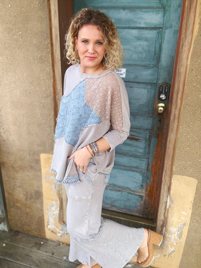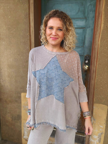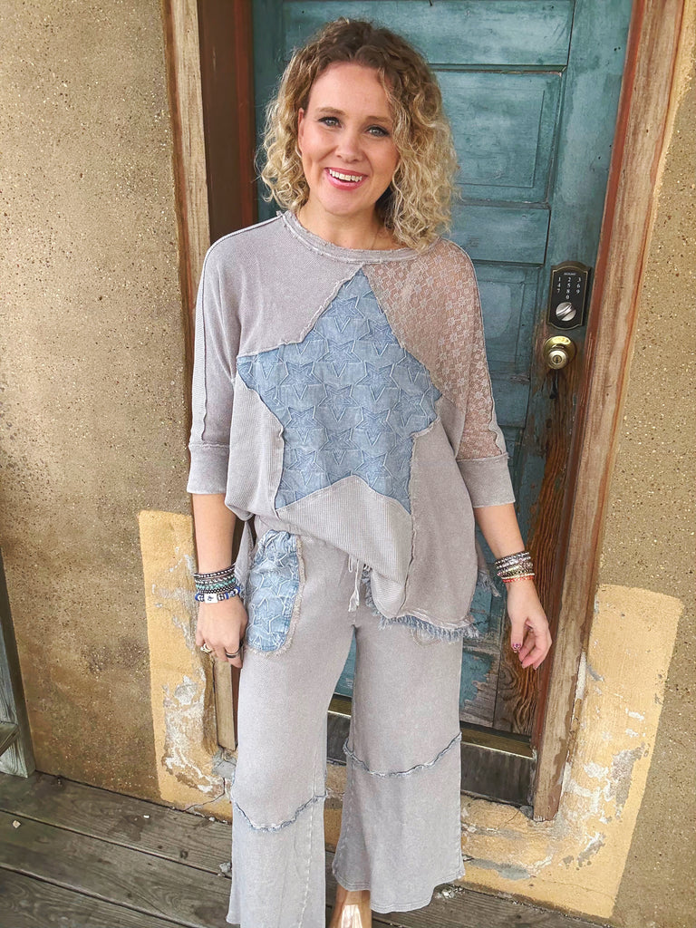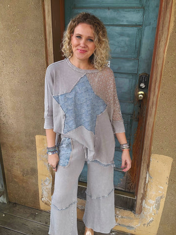 This super cool two-piece set is the definition of effortless style. Featuring a relaxed, mineral-washed finish with subtle star patchwork details, this set includes a loose-fit top and coordinating wide-leg bottoms that can be worn together or mixed and matched with your everyday favorites.