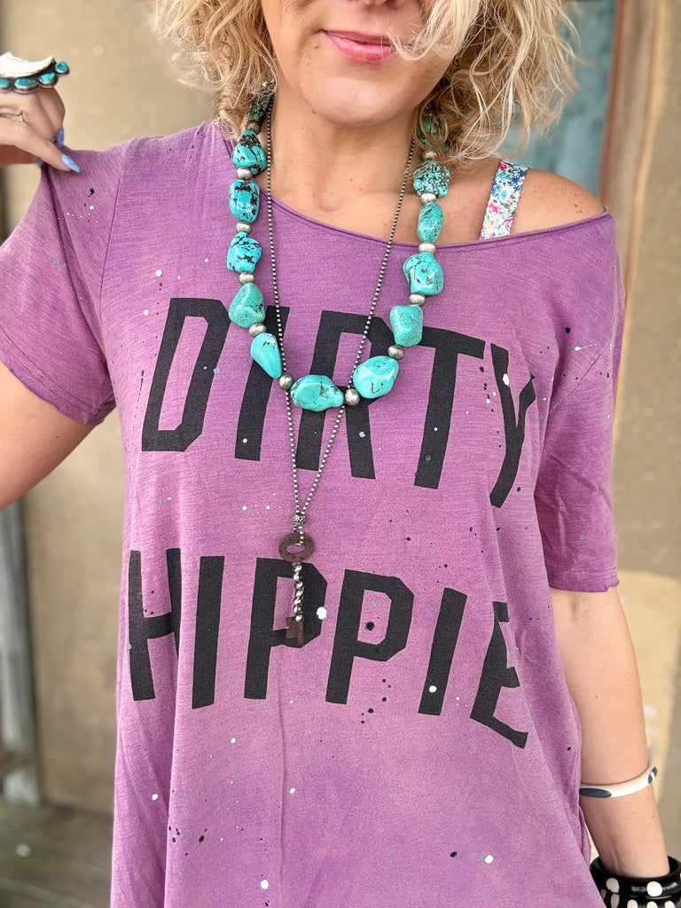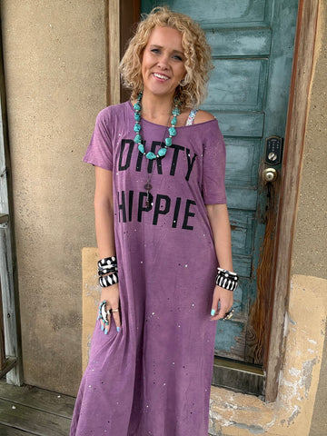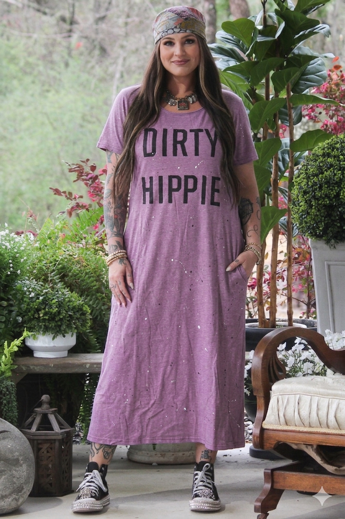 Effortless, edgy, and full of that signature free-spirited attitude — the Dirty Hippie Dress in Vintage Berry is the ultimate throw-on-and-go statement piece. Featuring bold “DIRTY HIPPIE” lettering with subtle splatter paint and light distressing, this dress has that perfectly worn-in, lived-in feel we all love.