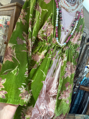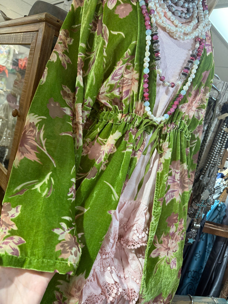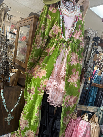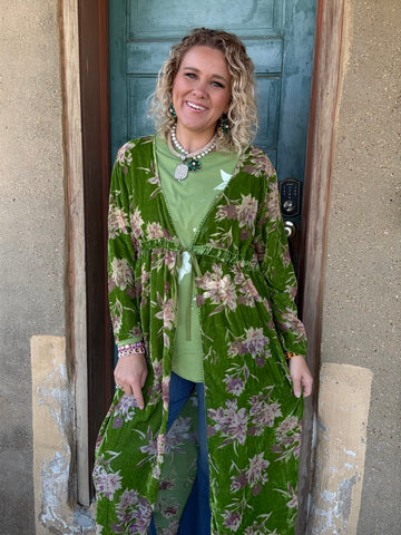 Wrap yourself in handmade elegance with this one-size (fits 6-18) long maxi duster from A Rare Bird. Crafted from rich green burnout velvet adorned with delicate floral patterns, it features a flattering drawstring waist to cinch your silhouette. Lightweight yet dramatic, this duster is perfect for layering and adding a touch of vintage-inspired glamour to any outfit.