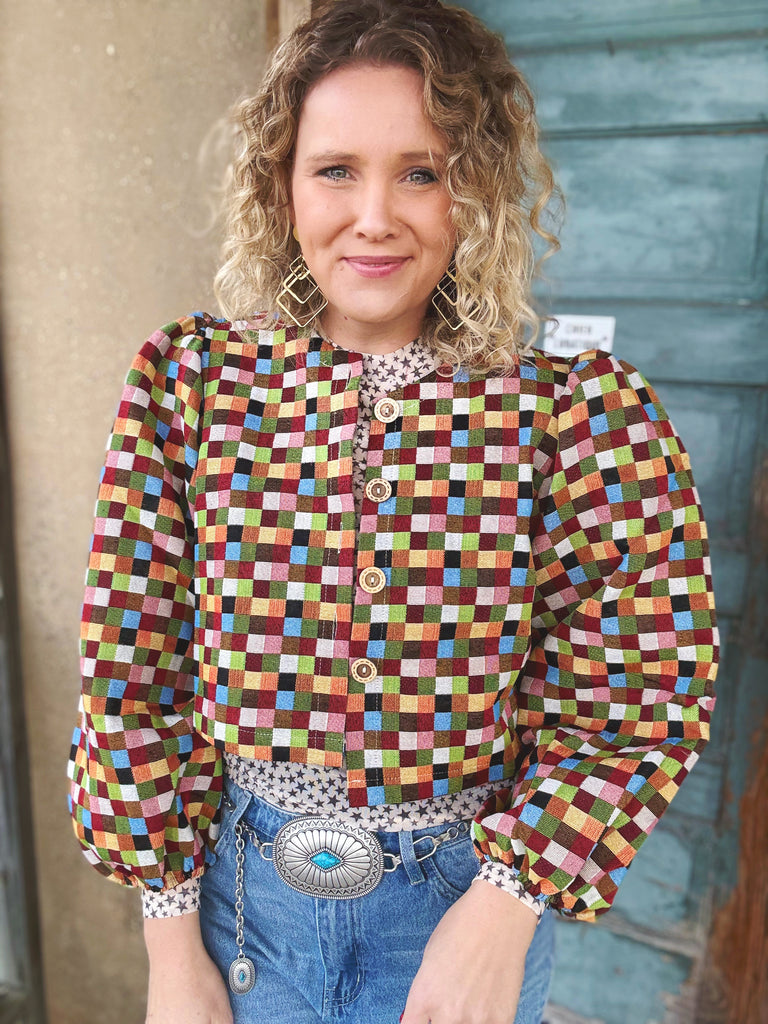 This cropped tapestry jacket brings a touch of vintage flair to modern styling. Made from a woven fabric, itβs ideal for warmer weather while maintaining a structured, oversized silhouette. The jacket features puff sleeves with elastic cuffs for a comfortable fit and adds playful volume to the overall look. Three large wooden button closures in the front give a natural, earthy touch. Available in two bold patterns: a striking black cheetah print and a colorful multicolor check design. Perfect for layering, this jacket offers a stylish and effortless finish to any outfit.