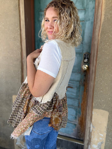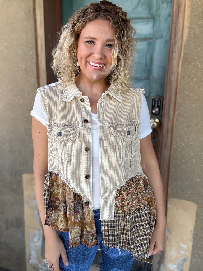 Layer on the charm this season with the Harvest Patchwork Corduroy Vest. In a warm tan wash with a playful plaid patchwork peplum, this piece is the perfect blend of rustic and boho. Lightweight yet full of personality, it’s made for fall layering—throw it over a tee, cozy sweater, or even a dress for instant texture and style.
