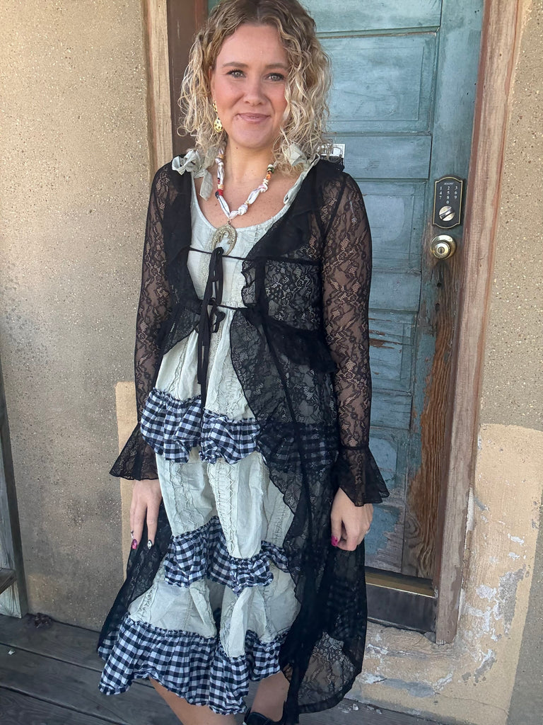 Ethereal, romantic, and effortlessly chic—the Moonlit Garden Duster is a sheer, longline layering piece that elevates any outfit. Crafted from lightweight floral lace, it features cascading ruffle trim, flared cuffs, and a mid-calf scalloped hem. The adjustable front tie allows for a customizable fit, while the flowing silhouette brings a dreamy Western-boho vibe. Perfect layered over tees, dresses, or matching separates for a statement look that’s both whimsical and elegant.