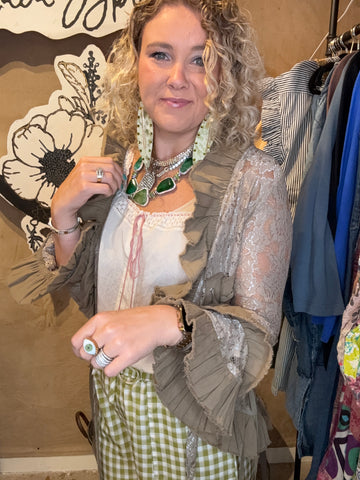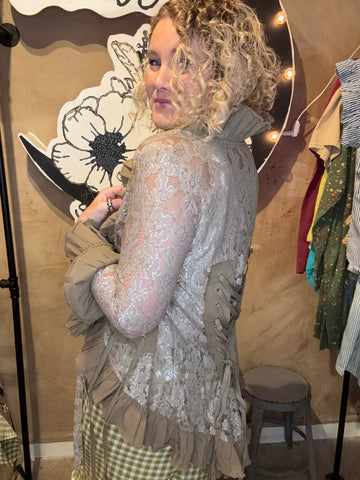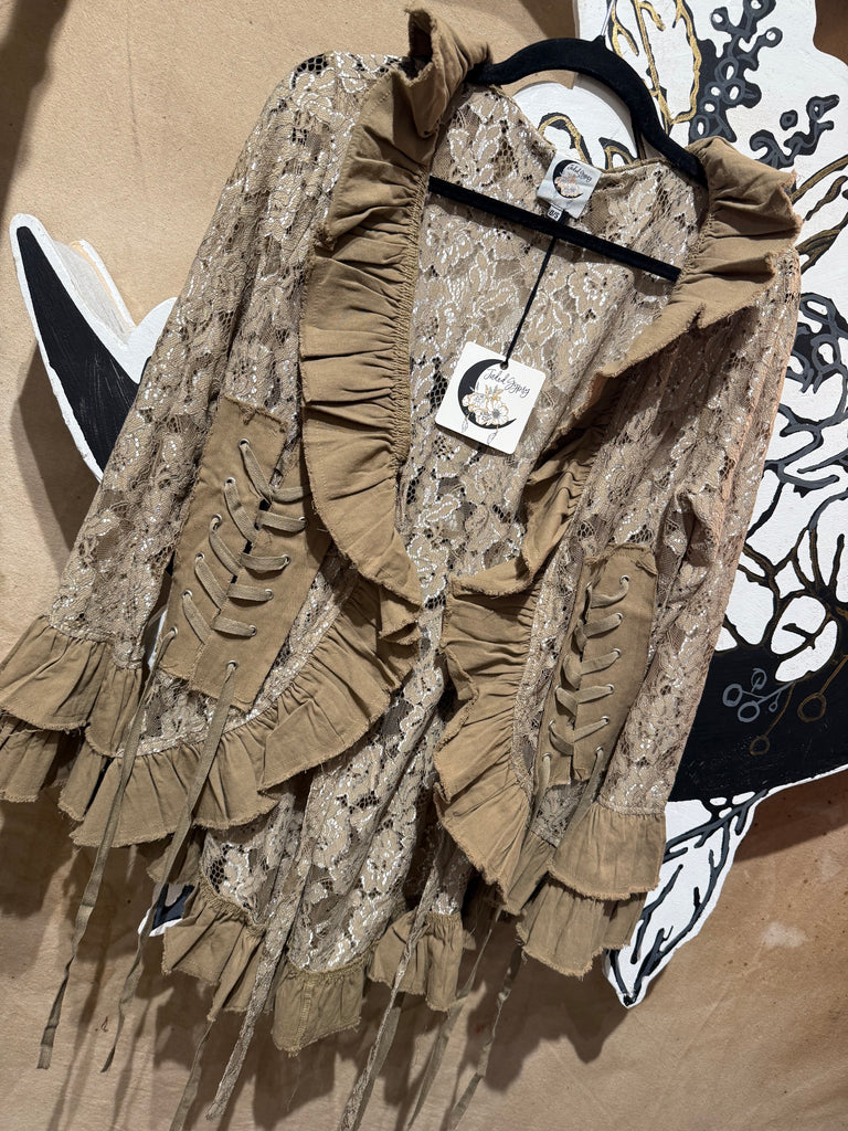 The JG Swoon with Grace Jacket features elegant ruffle lace and corset details, designed to flatter a range of sizes from small to large. Its fitted, stretchable arms provide a comfortable yet tailored fit, making this one-size jacket versatile and stylish for various body shapes. Perfect for adding a graceful touch to your wardrobe.