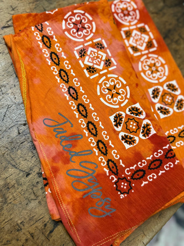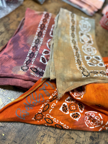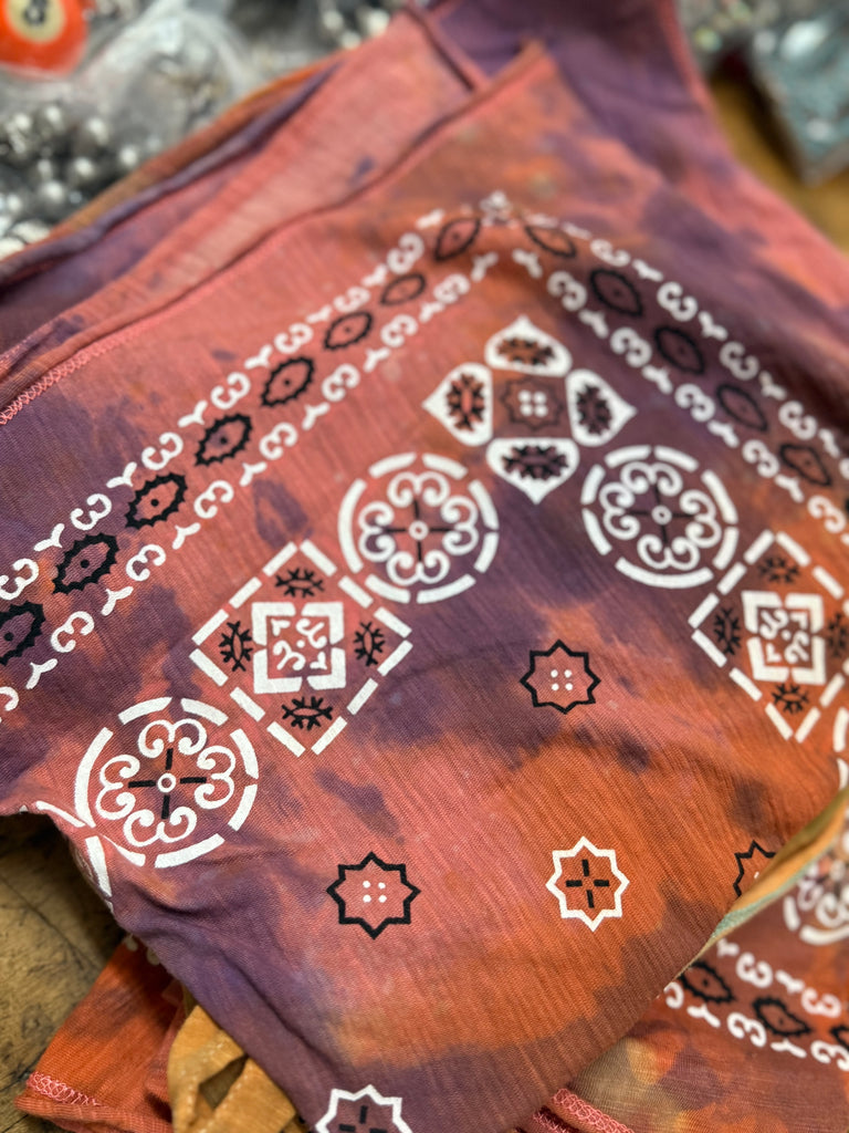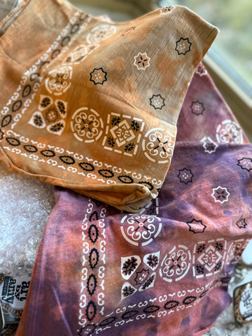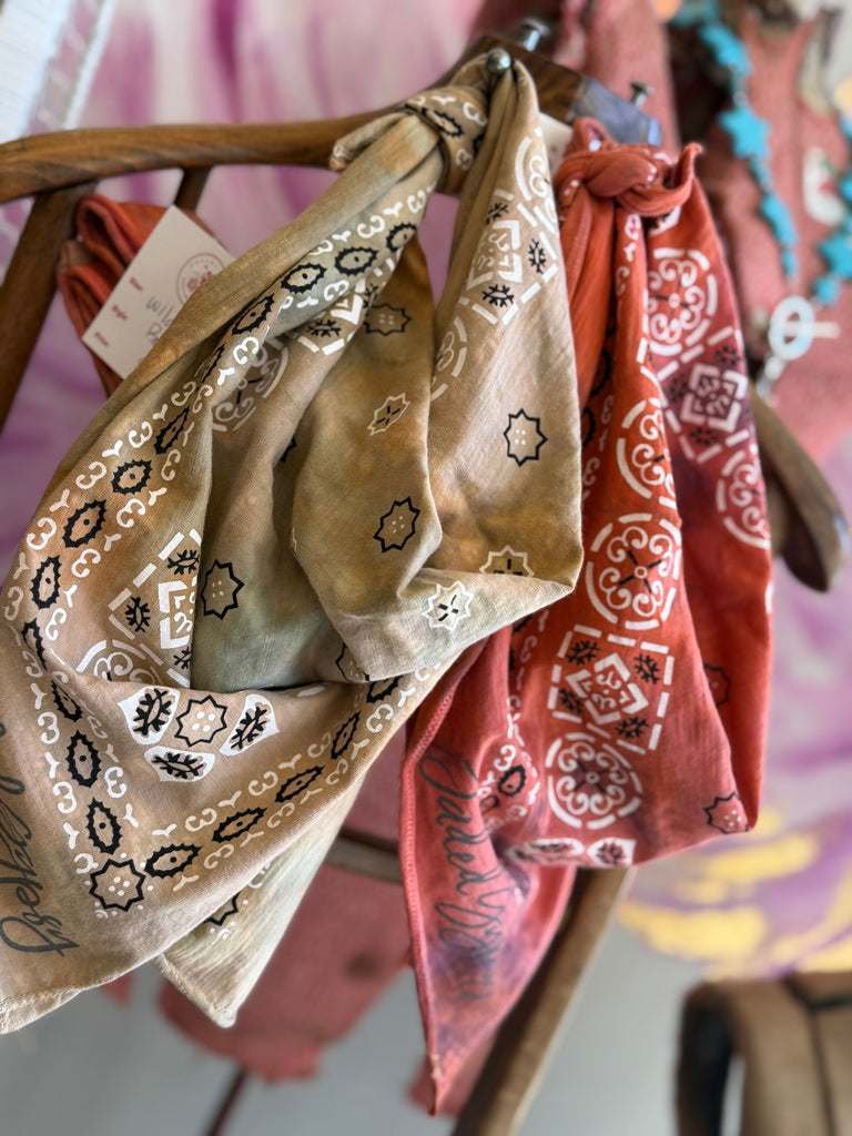 Each one is a work of art! Hand-dyed by Jaded Gypsy, these one-of-a-kind bandanas can be styled endless ways — wear as a head wrap, neck scarf, bag accent, or even a top. Free-spirited and fabulously fun.