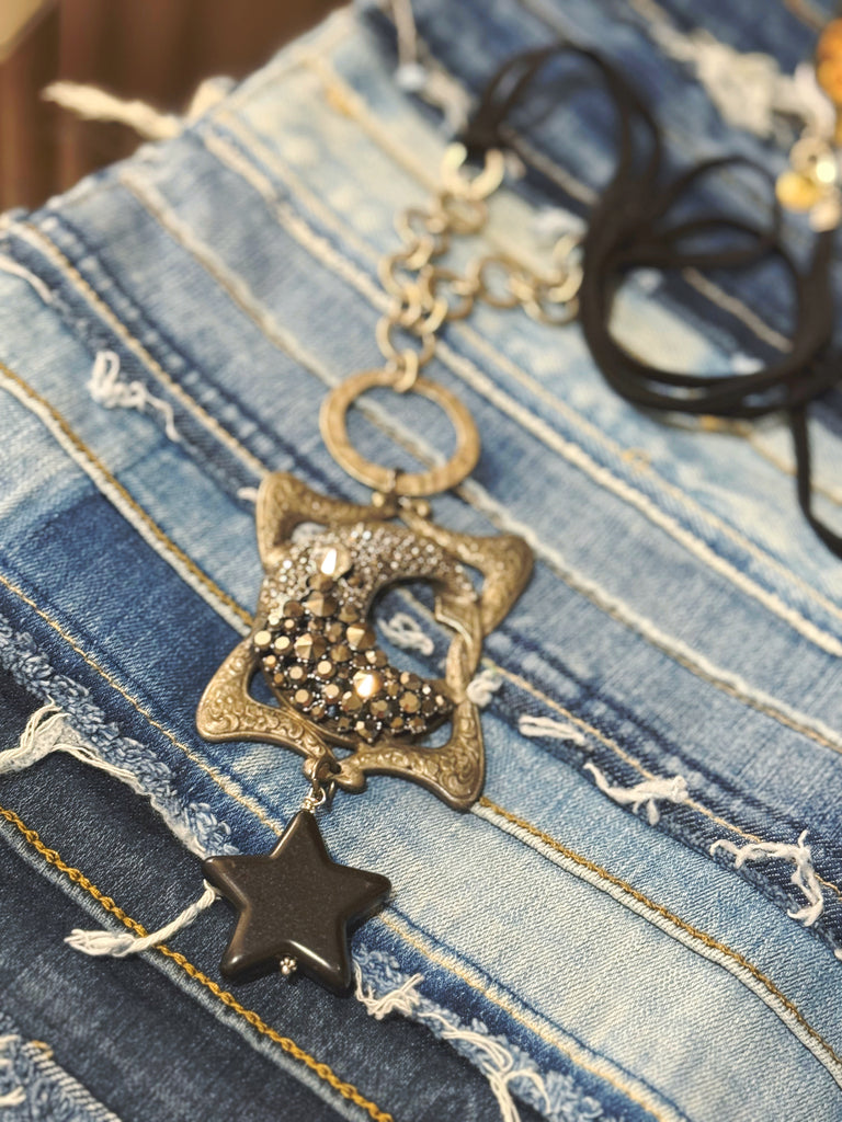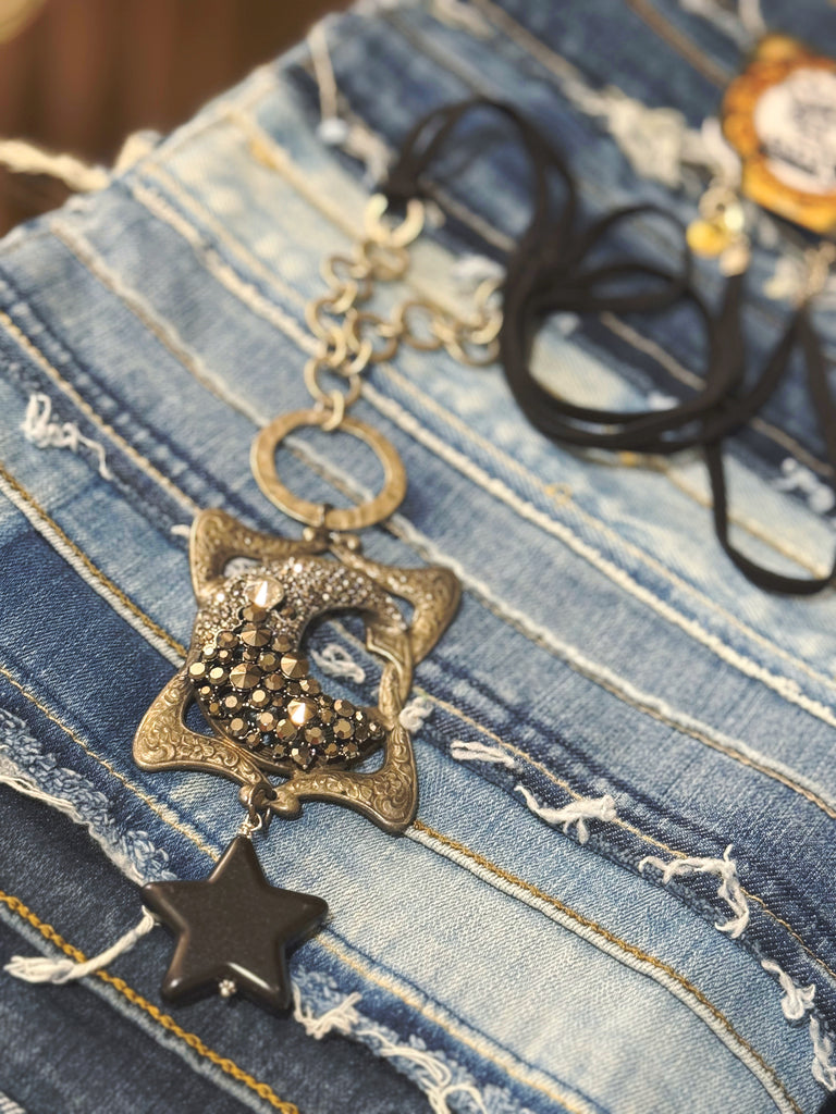 This necklace features a blinged crystal moon set inside a silver frame, with a black star pendant hanging below. Dreamy, mystical, and full of sparkle—this piece brings a little night-sky drama to any outfit.
