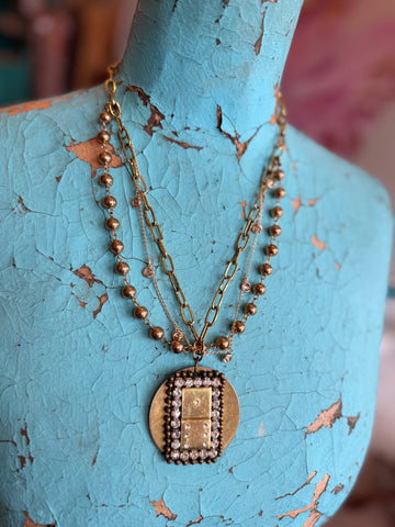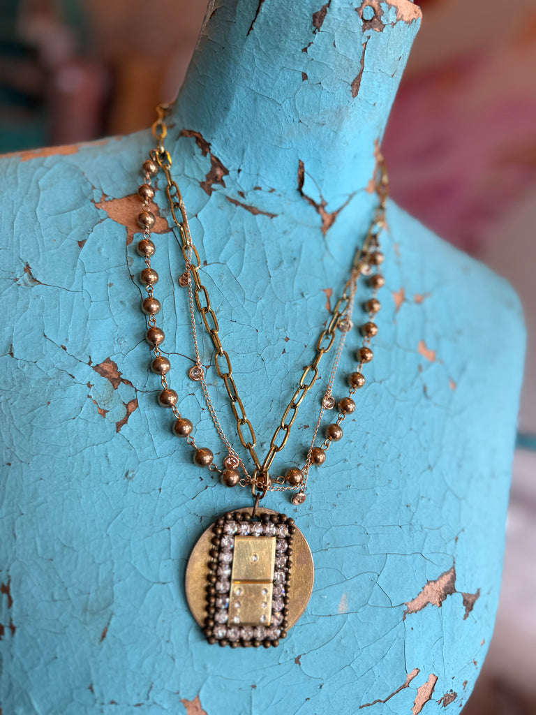 A playful mix of glam and vintage vibes, this triple-chain gold necklace features a sparkling domino pendant that adds just the right amount of bling 🎲✨