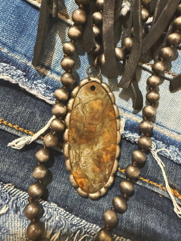 This necklace features faux Navajo pearls, a stone pendant, and black leather fringe cascading from each side. Cool, bold, and undeniably unique—this one makes even the simplest outfit feel styled.
