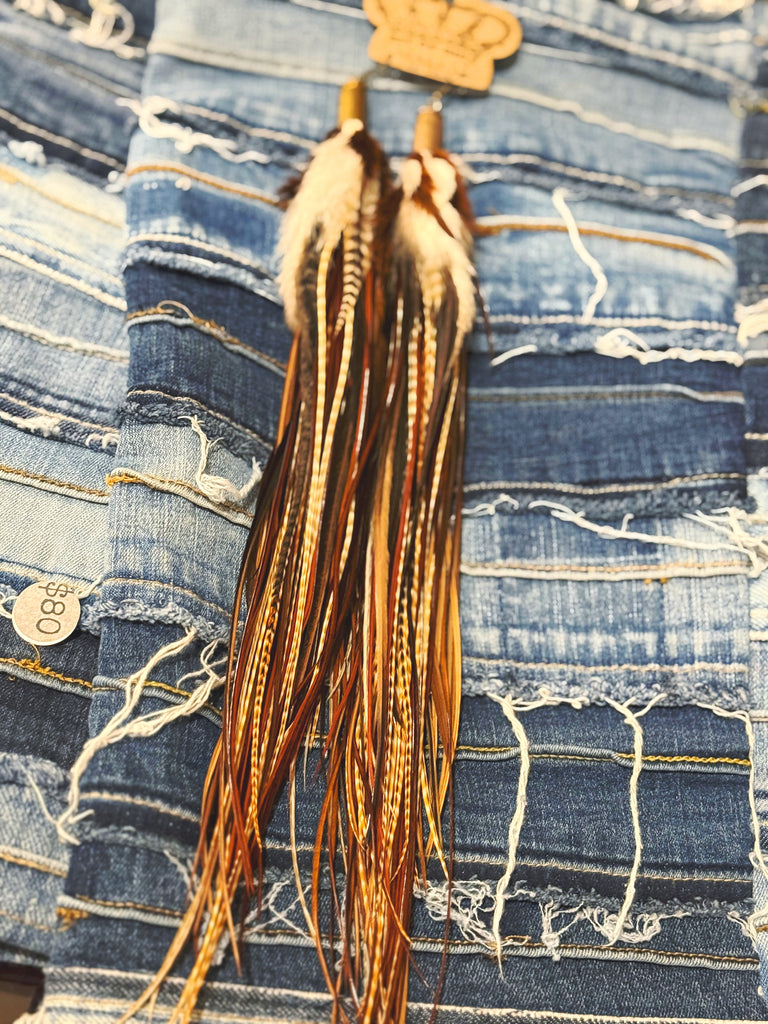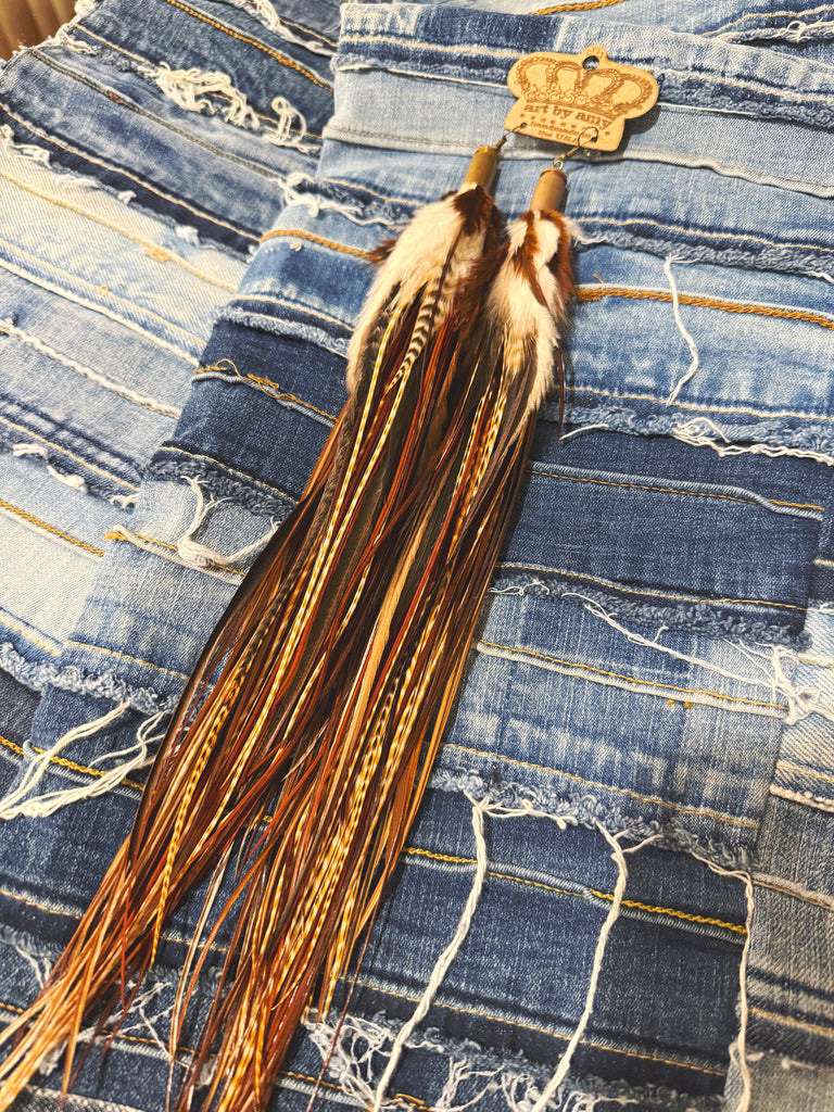 These guinea chicken feather earrings feature rich shades of brown, ivory, and copper for a natural, earthy elegance. Lightweight and free-spirited, they can be worn traditionally or styled creatively into your hair for a bold boho moment.