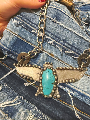 This thunderbird pendant features a real turquoise stone and delicate soldered dot detailing. Clean, classic, and powerful—this is the kind of piece you’ll reach for again and again.