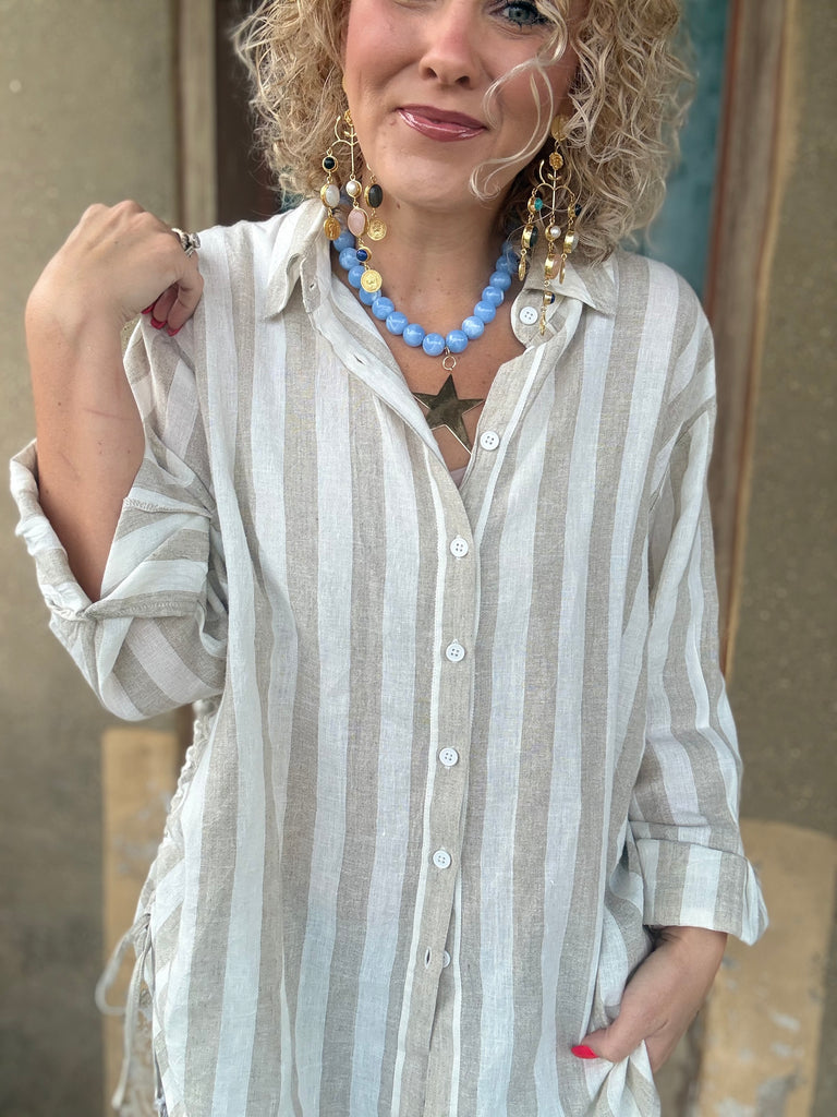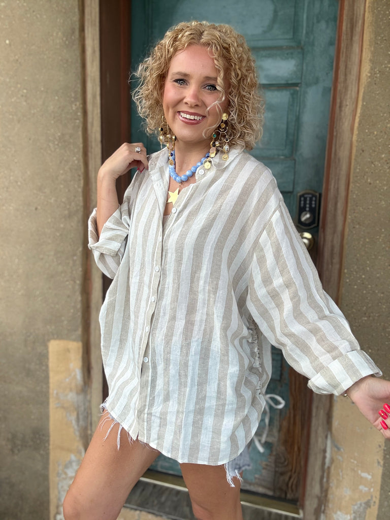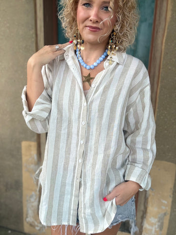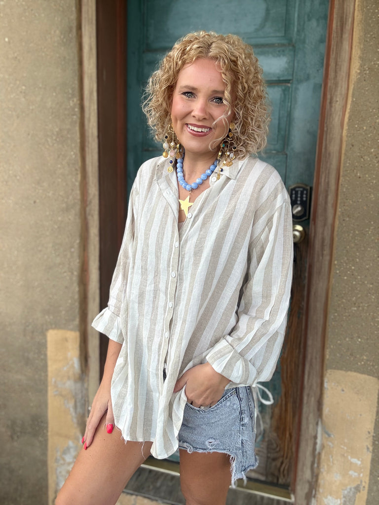 Effortlessly relaxed with a touch of refined detail, the Coastal Ease Linen Top is your go-to for laid-back, everyday styling. Crafted from breathable linen in soft oatmeal and ivory stripes, this roomy-fit silhouette feels light, airy, and easy to wear.