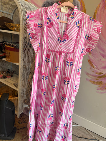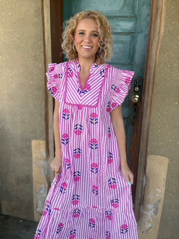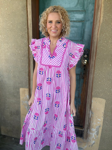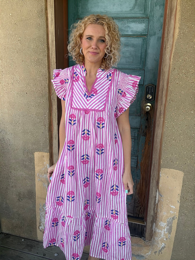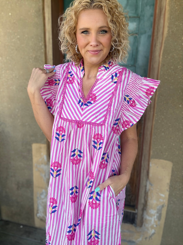 Sweet, playful, and full of charm π The Pink Lemonade Garden Dress features classic vertical stripes paired with colorful embroidered-style florals for the prettiest pop of detail. Designed with a flattering notched V-neckline, delicate lace trim, and fluttery ruffle sleeves that add the perfect feminine touch.