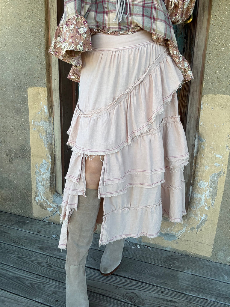 Soft, swishy, and full of free-spirited charm ā the Prairie Muse Tiered Maxi Skirt is made for wandering hearts and creative souls. Its flowy silhouette features cascading asymmetrical tiers with raw-edge ruffles and subtle pink stitching for a perfectly undone, vintage-inspired finish. Lightweight and easy to wear, it moves beautifully with every step and pairs effortlessly with everything from graphic tees to lace blouses.
