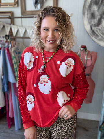 Get ready to sleigh the season in the Santa Sparkle Sequin Pullover! This merry must-have features jolly Santa faces scattered across a soft, mineral-washed red backdrop β with glittering sequin sleeves that bring just the right amount of sparkle. Comfy, oversized, and oh-so-fun, itβs the perfect mix of cozy and festive flair.