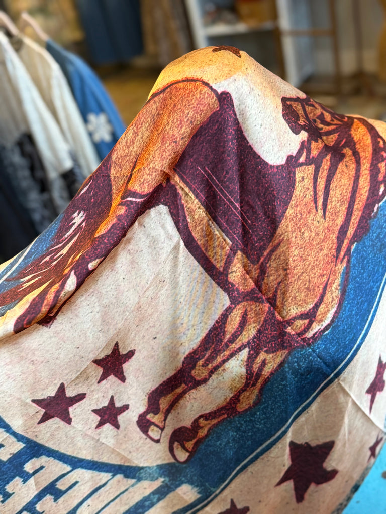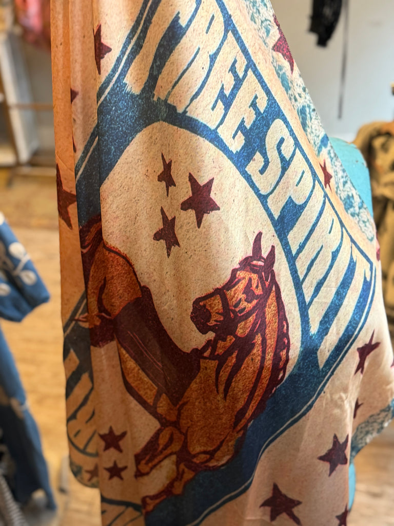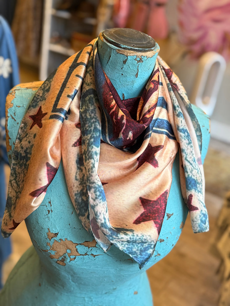 This soulful wild rag features a striking horse at the center, surrounded by stars and earthy champagne, brown, and blue tones. The phrase “FREE SPIRIT” anchors the design, making it a powerful piece for wanderers and dreamers.