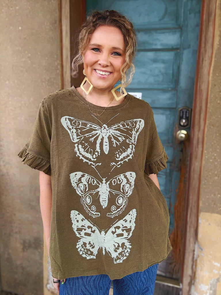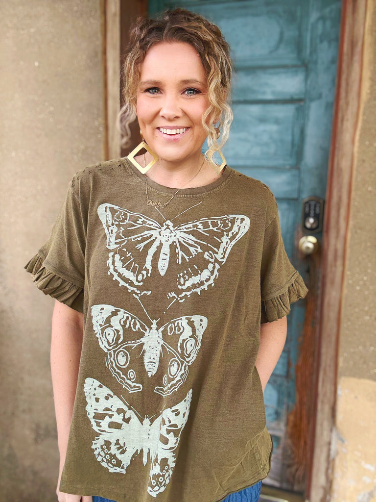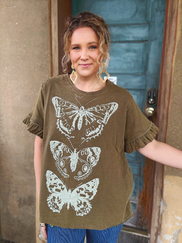 An effortless boho essential with an artful twist. The Earthbound Butterfly Tee features a soft, washed brown base adorned with a vintage-inspired butterfly graphic that feels both grounded and free-spirited.
