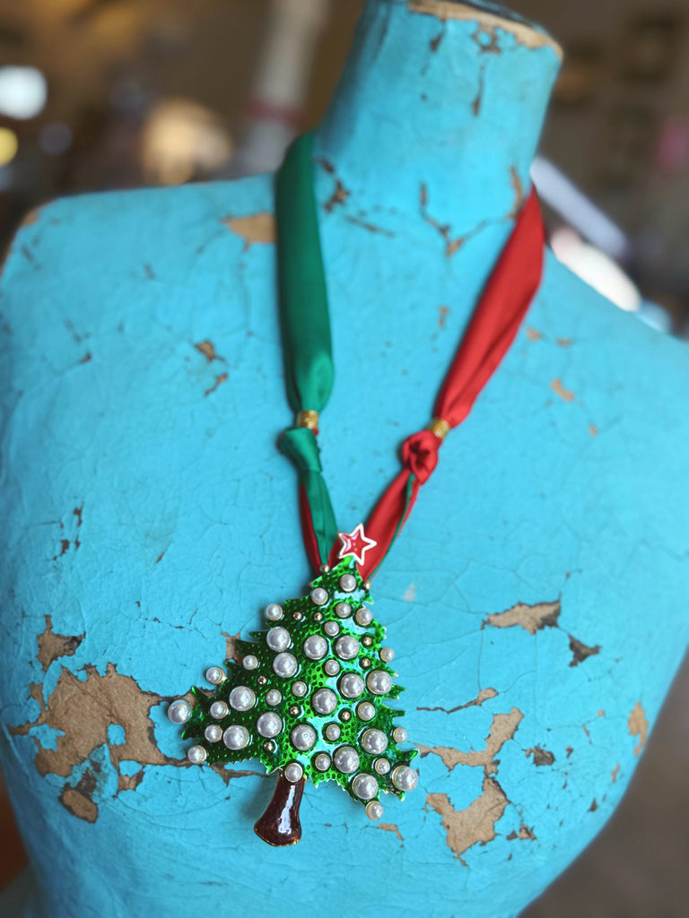 A classic holiday palette with a Jennifer Thames twist. This necklace showcases a large green Christmas tree pendant covered in pearls, paired with a rich red and green scarf. Bold, festive, and timeless—this piece is made to stand out at every holiday gathering.