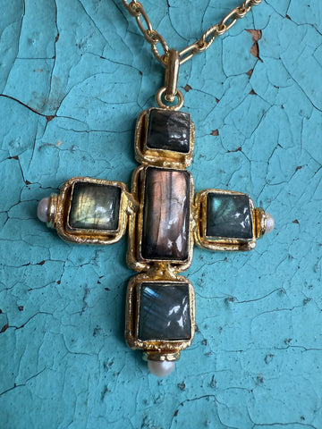 A soulful statement crafted with authentic high-quality labradorite. This gemstone cross shimmers with natural flashes of blue and green, suspended from a classic gold chain.