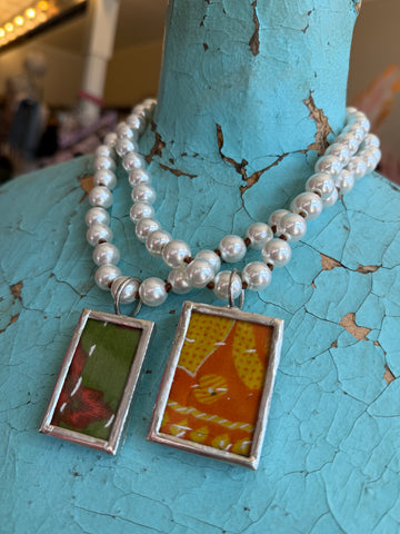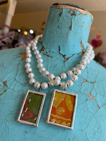 Handcrafted from a vintage Kantha textile behind glass on a knotted faux pearl strand, this necklace features orange/yellow on one side and green/red on the other, making it perfect for holidays or year-round wear. Unique, artisanal, and effortlessly eye-catching.