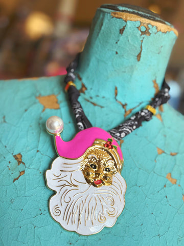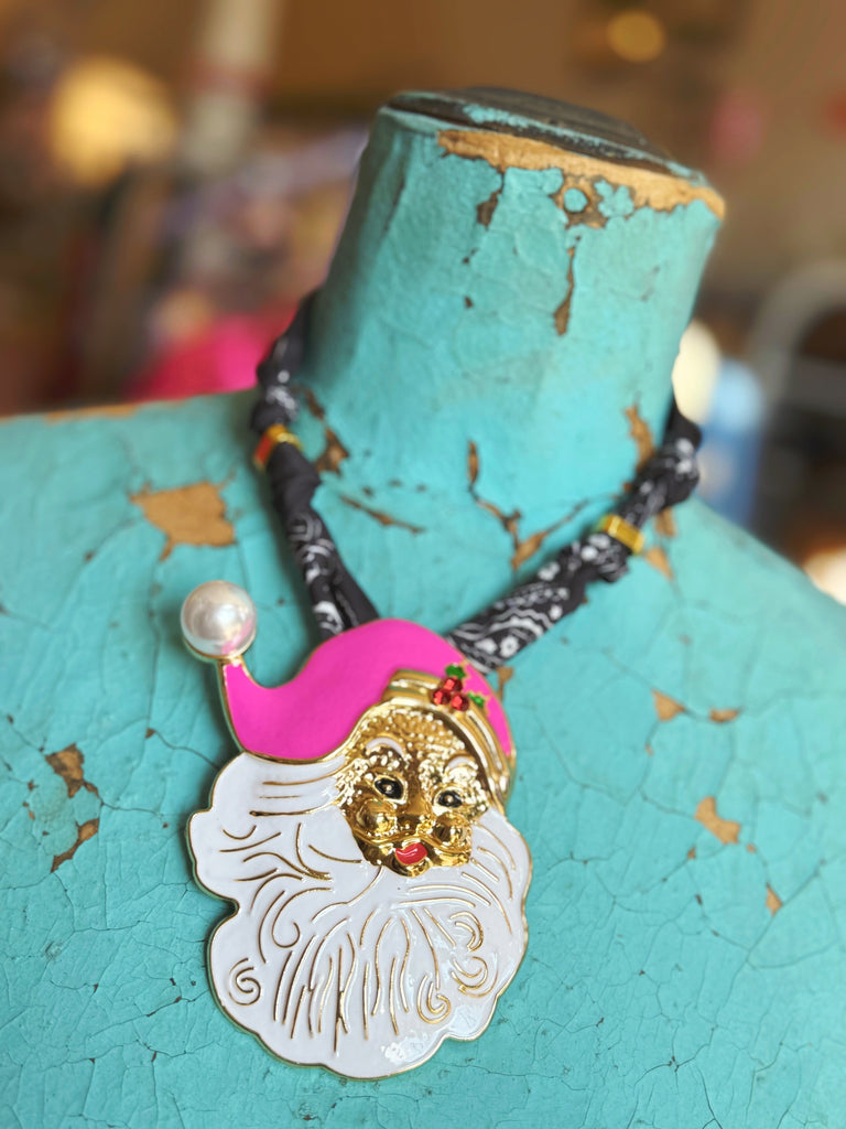 This playful Santa makes a bold holiday statement! Featuring Santa wearing a pink hat on a black bandana-style scarf, this piece blends classic Christmas imagery with a modern, fashion-forward edge.