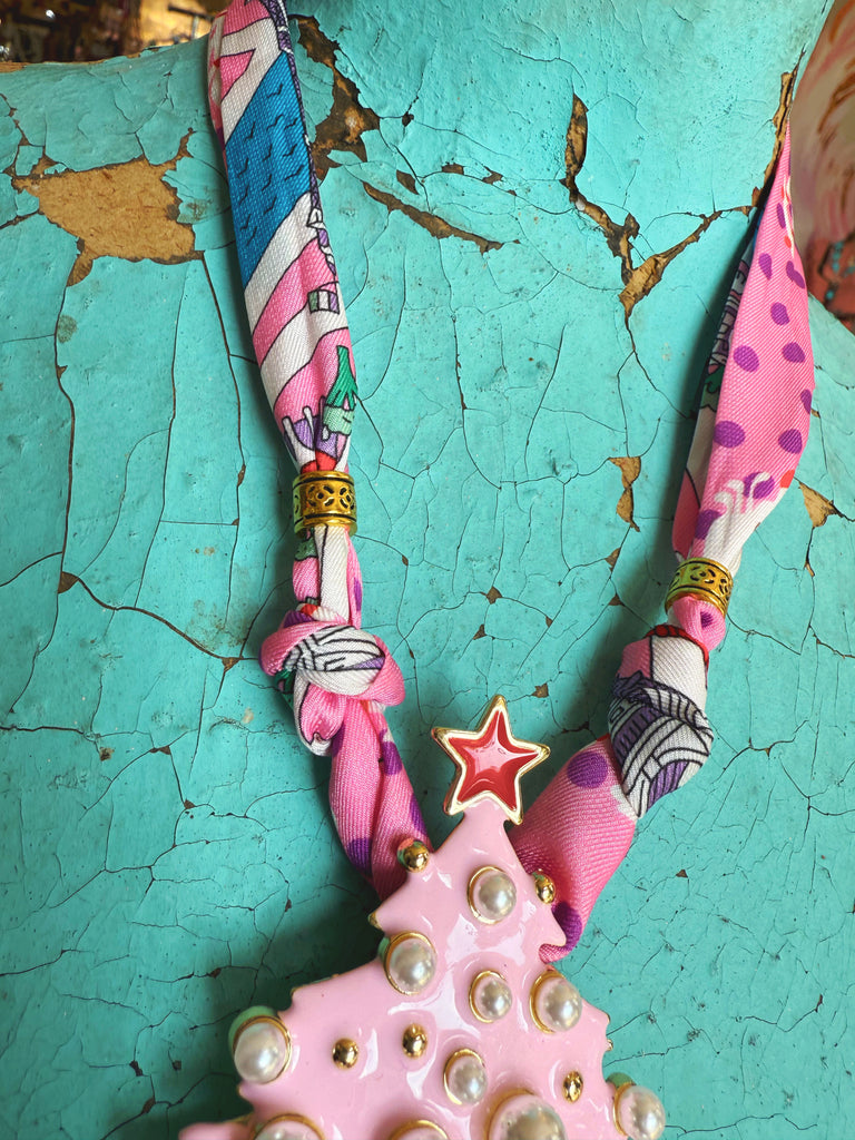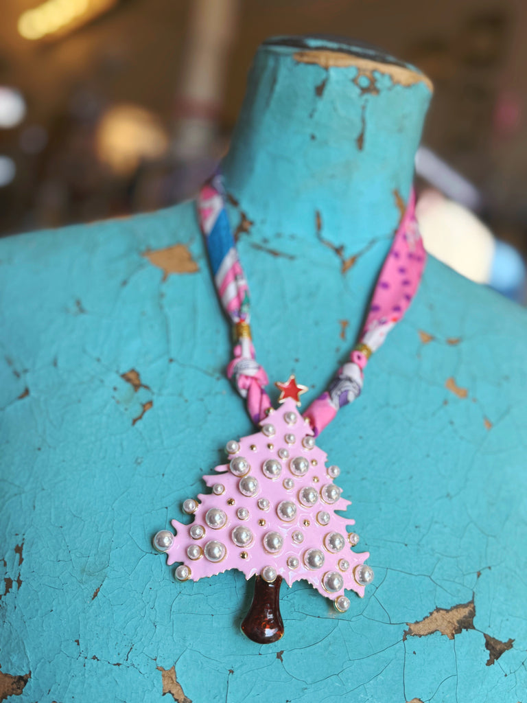 This joyful holiday statement features a large pink Christmas tree pendant completely adorned in luminous pearls, suspended from a soft pink and blue scarf. Playful yet polished, this piece brings a touch of whimsy and sparkle to any winter outfit. A perfect mix of feminine charm and festive cheer.