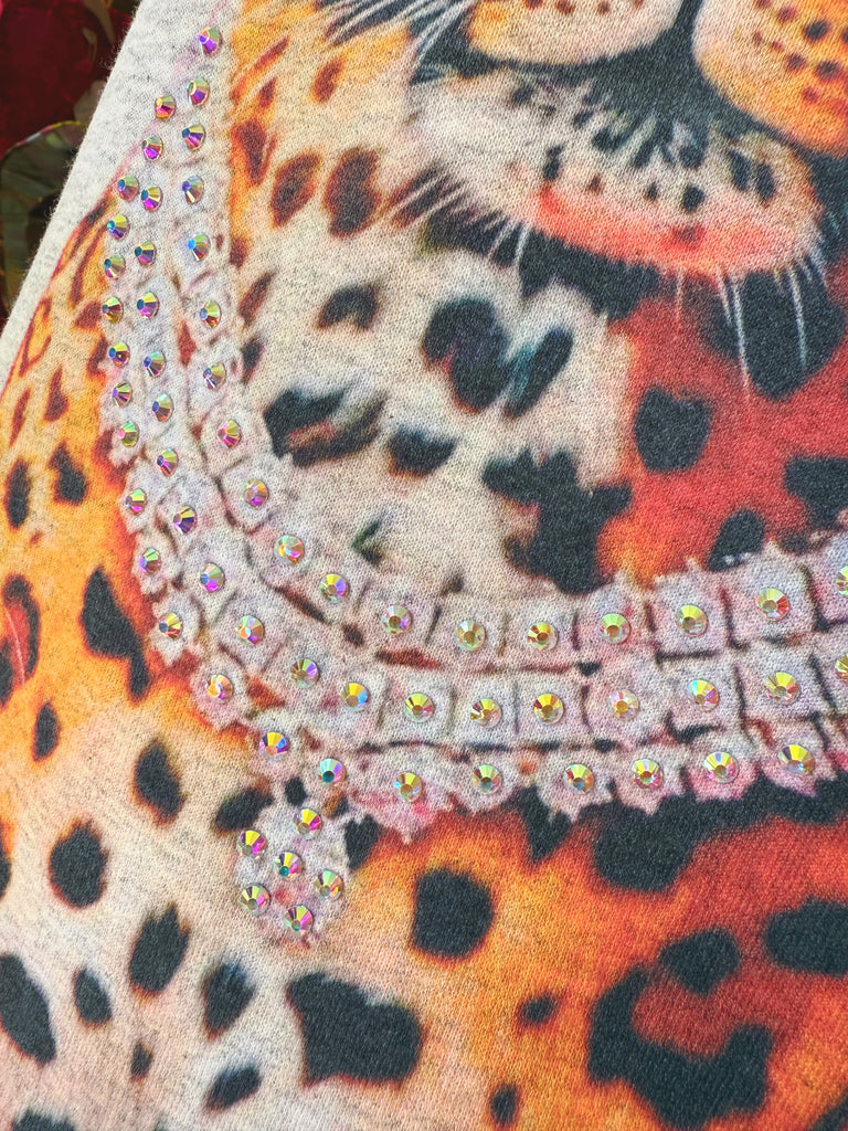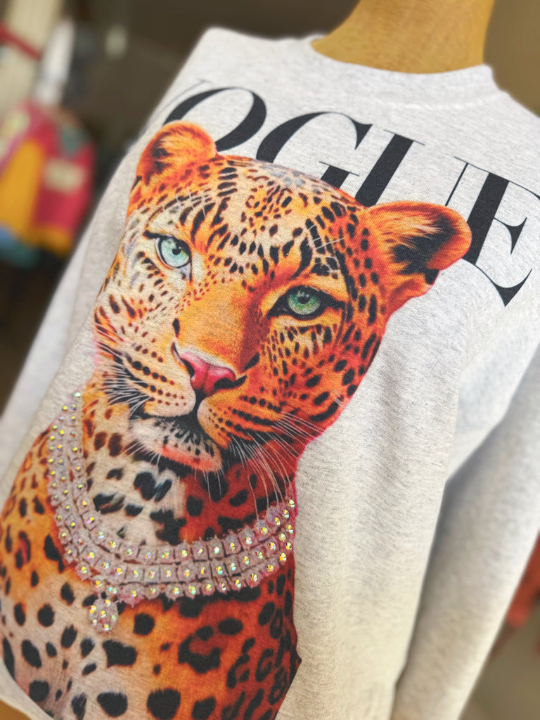 Unleash your inner fashion icon in this statement sweatshirt featuring a jeweled leopard straight off the cover of Vogue.✨ Over 70 hand-applied crystals sparkle across her diamond collar, giving this cozy gray pullover the perfect dose of wild glam.