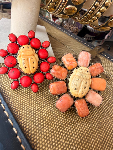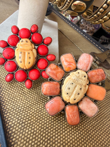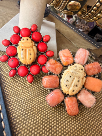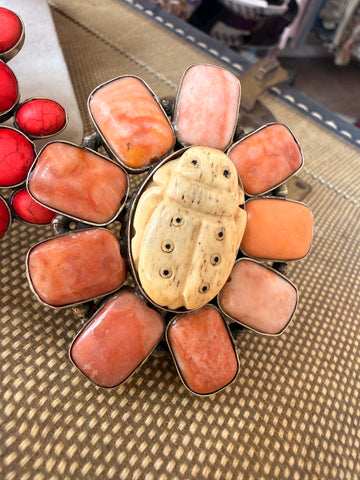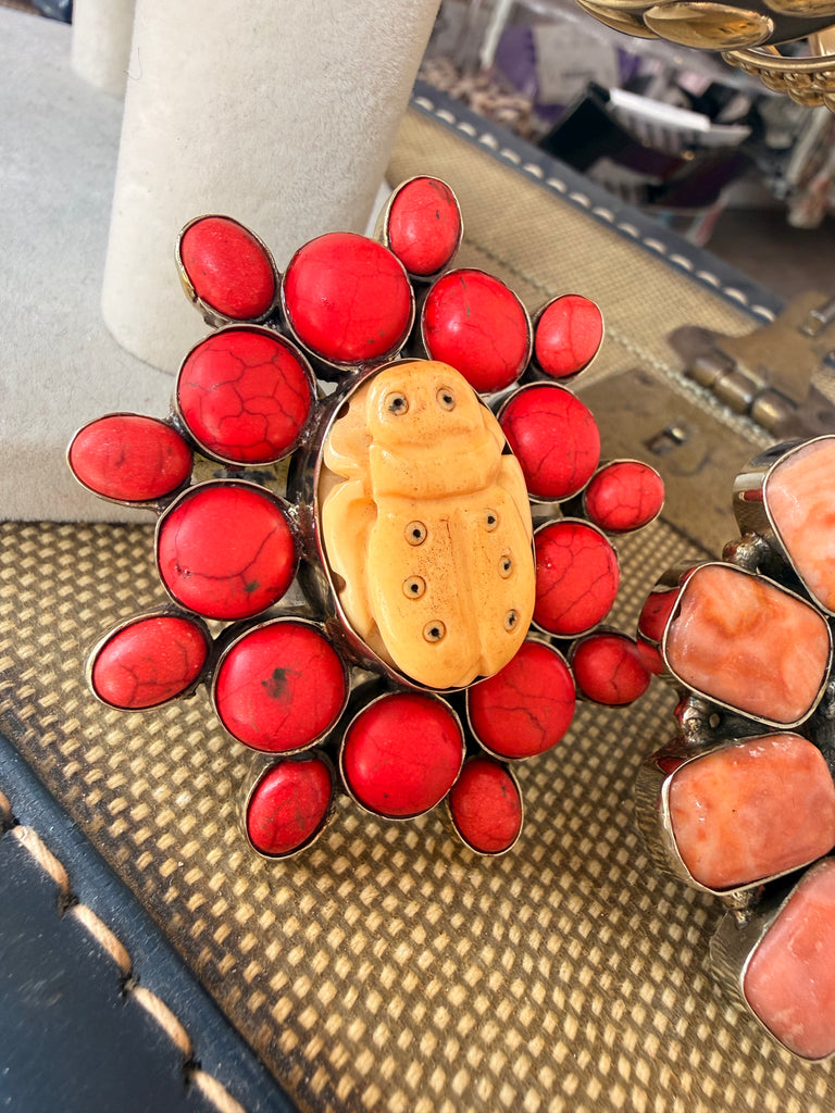 Bold, symbolic, and full of meaning — the Sacred Scarab Ring features a hand-carved bone beetle centerpiece surrounded by vibrant stones. Available in red or coral accents, this piece represents transformation, protection, and renewal.