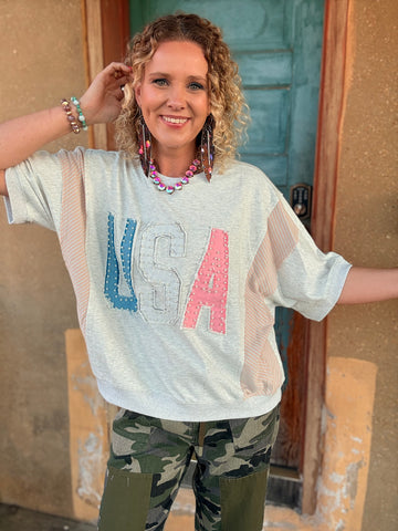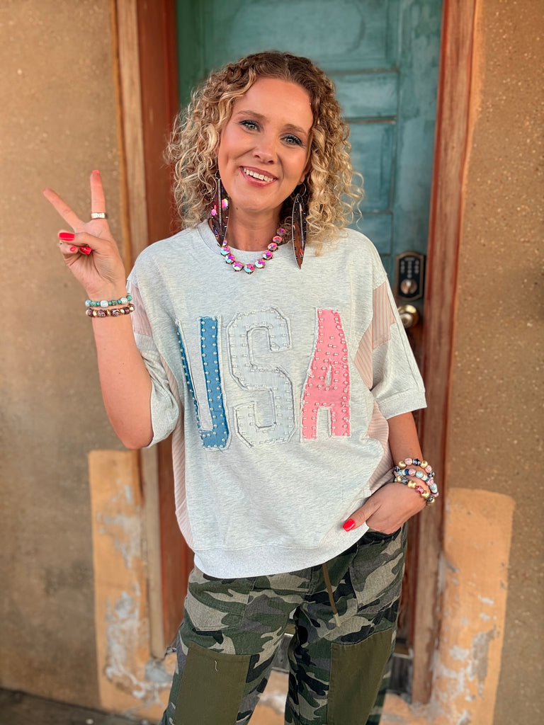 Show your American spirit with a little Poetry Tea flair in the Stars & Stripes USA Pullover. This relaxed-fit sweatshirt features bold USA patch lettering in soft red, white, and blue tones, accented with pearl details for just the right amount of sass.