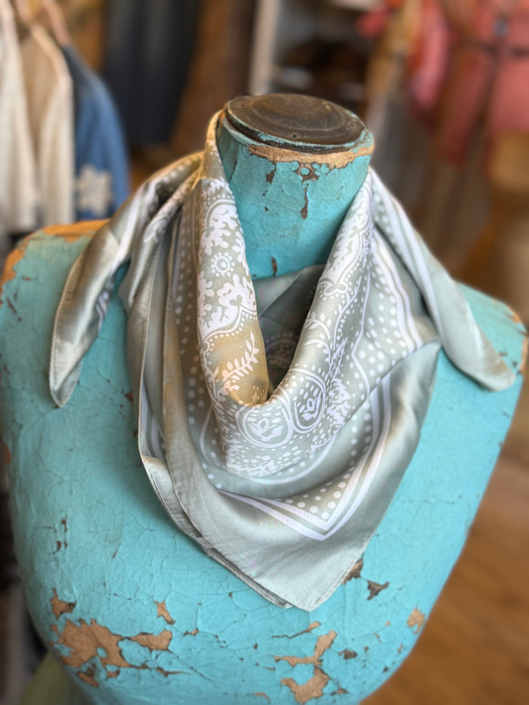 Soft and subtle, this light sage green wild rag features a classic paisley bandana print accented with delicate dot detailing. A timeless neutral that adds a gentle pop of pattern without overpowering your look.