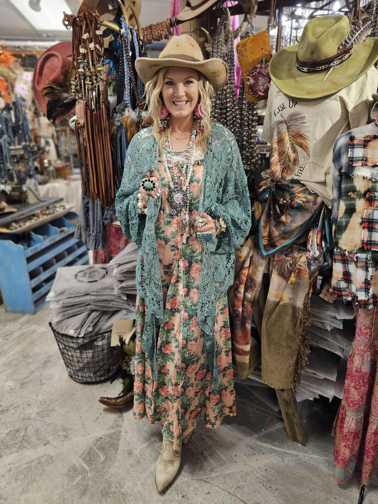 This oversized teal cardigan features a delicate lace and crochet design, creating a soft, breathable layer perfect for cozying up. It ties at the front for an adjustable fit, offering both comfort and style. Ideal for adding a touch of warmth without bulk, this throw-over enhances any outfit with its unique texture and relaxed silhouette.