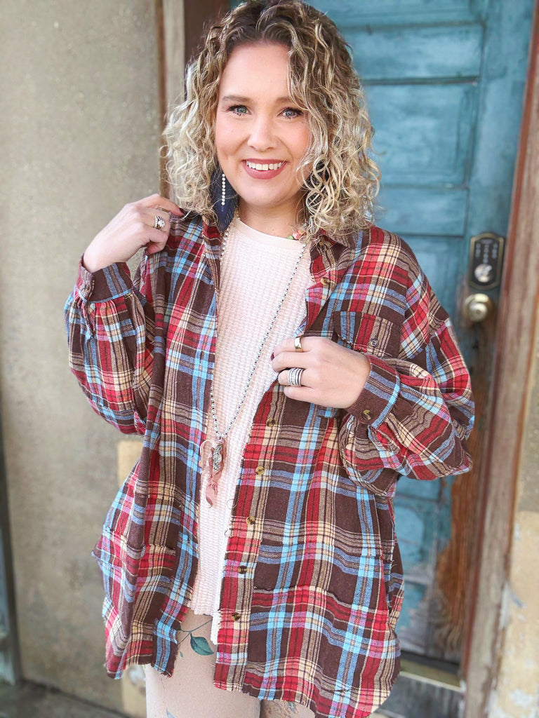 Meet the Warm Meadow Plaid Top — the coziest oversized flannel with all the cool-girl charm. This top blends rich shades of brown, red, and soft sky blue in the prettiest plaid pattern, giving it that warm, rustic, fall-forward vibe we love.