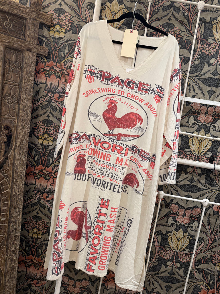 This long sleeve dress features flour-sack-inspired fabric with rooster imagery and vintage-style text, honoring garments once made from upcycled feed sacks.