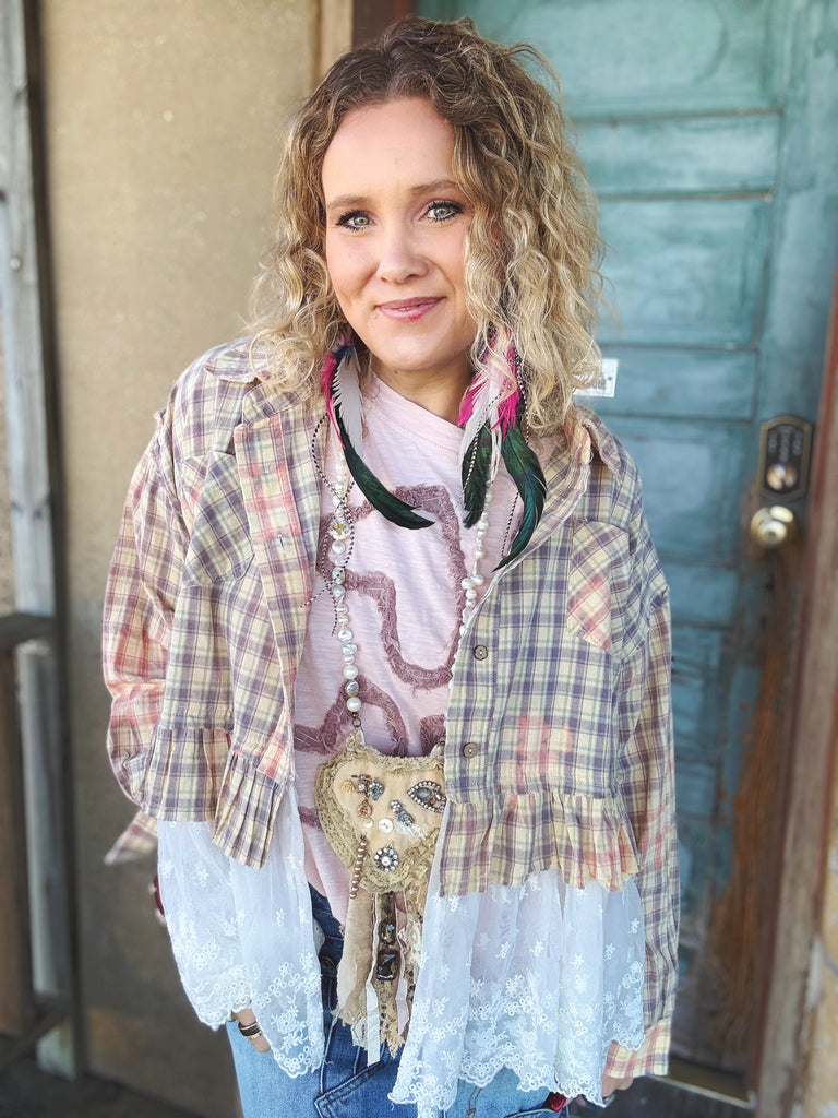 he Heirloom Daydream Plaid Top is a love letter to soft layers and feminine details. Designed with a relaxed babydoll silhouette, this mixed-media beauty blends muted plaid with delicate lace for a look that feels both vintage-inspired and effortlessly modern. The button-up front and easy fit make it perfect for styling loose and flowy or partially tucked for a laid-back boho vibe.