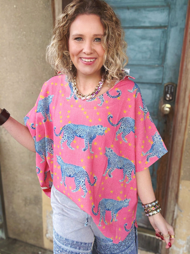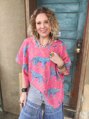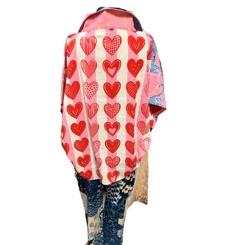 A statement top made for the free-spirited and the fun-loving. This oversized beauty features a vibrant pink leopard print sprinkled with golden stars on the front, while the back surprises with a bold red heart pattern on soft pink stripes — giving you a playful two-in-one look.