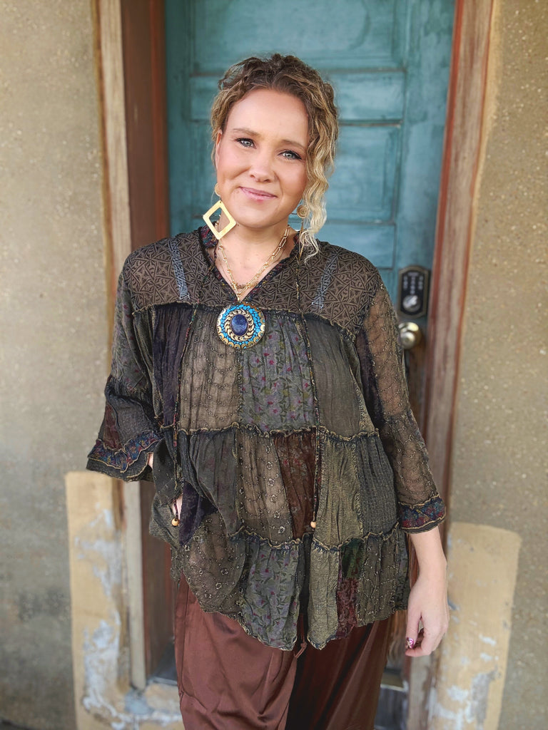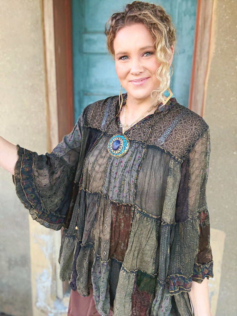 The Midnight Tapestry Blouse is a beautifully layered bohemian dream. Crafted from a mix of sheer, textured fabrics with subtle patchwork detailing, this top has a soulful, collected-over-time feel that makes every outfit instantly special.